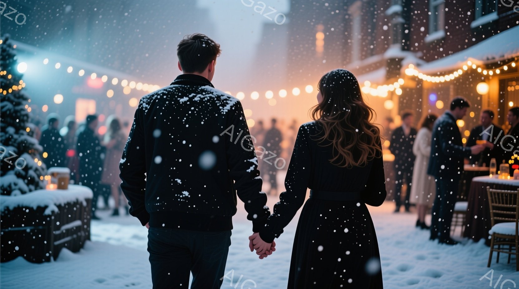 雪が舞う中で、一人の男性が赤いバラの花束を女性に差し出しています。男性は黒いコートに赤いセーター、女性は赤いコートを着ており、共に微笑んでいます。背景には、クリスマスツリーの飾りが灯り、ロマンチックで暖かな冬の雰囲気が漂っています。