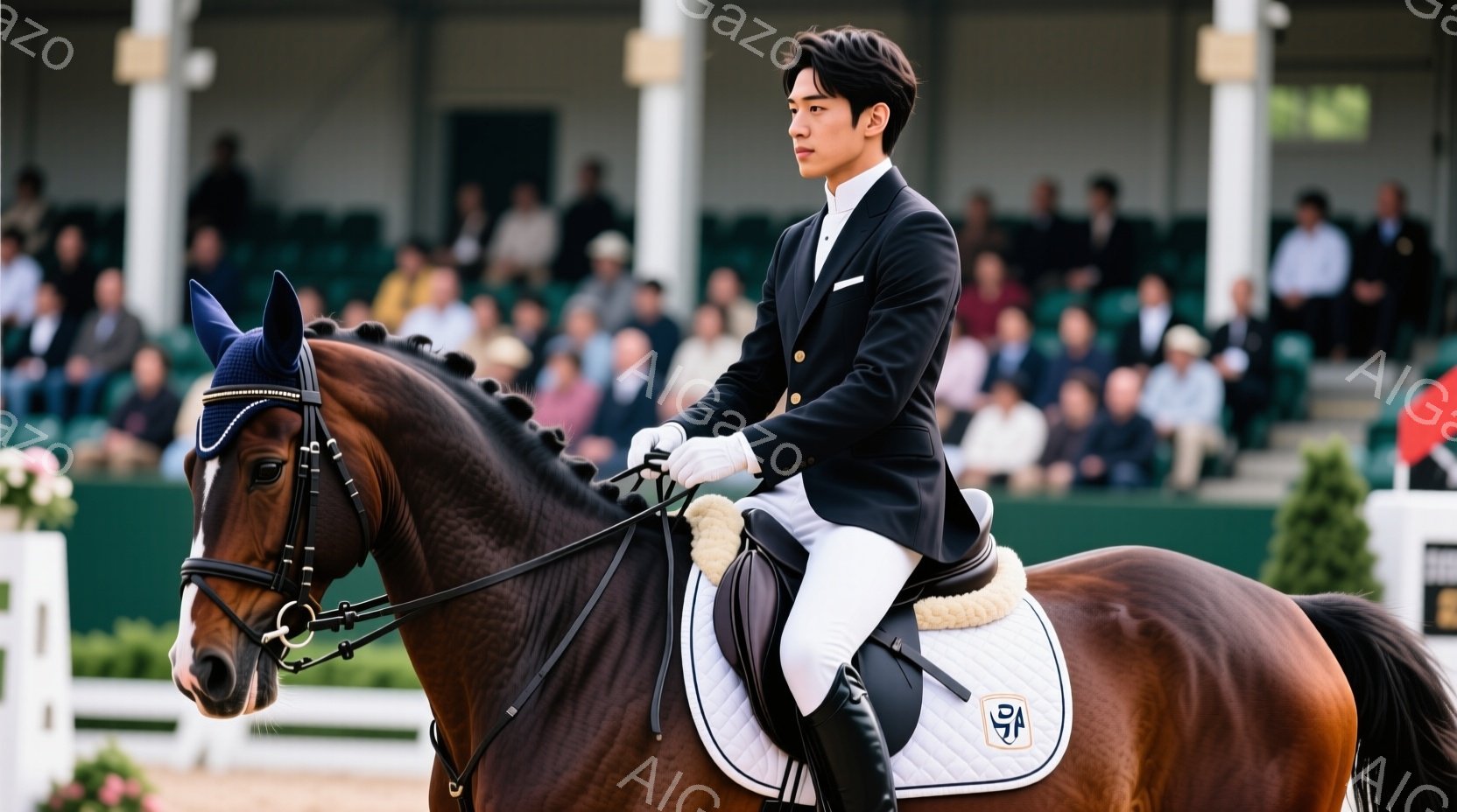 深い栗色の馬に乗った男性は、黒のジャケットと白いシャツ、白いズボンという正装を身につけている。彼はまっすぐな姿勢で、手綱を握り、集中した表情で馬を操っている。背景には白いフェンスや建物が見え、晴天の下、競技会のようなフォーマルな雰囲気が漂っている。