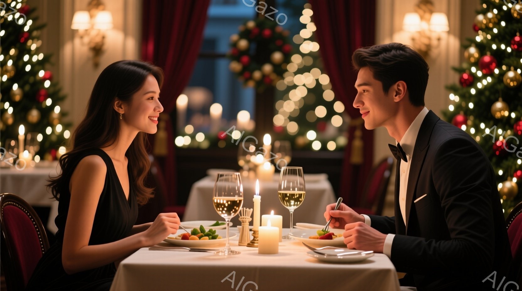 豪華なレストランで、一対の男女が向かい合って食事をしている。男性は黒いスーツに赤いネクタイ、女性は赤いドレス姿で、ともに整った髪型をしている。背景には、金色の装飾が施された壁とシャンデリアが見え、ロマンチックで洗練された雰囲気を醸し出している。