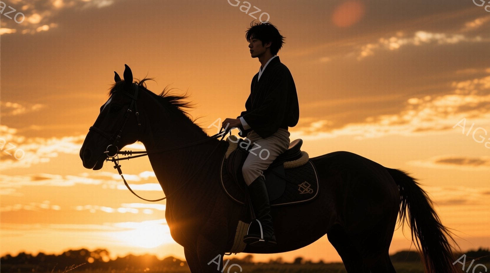 黒い馬に乗った男性が夕焼けを背景にシルエットで描かれています。男性は白いズボンと黒いジャケットを着用し、髪は短く整えられています。背景はオレンジと黄色のグラデーションで、穏やかで壮大な雰囲気を醸し出しています。