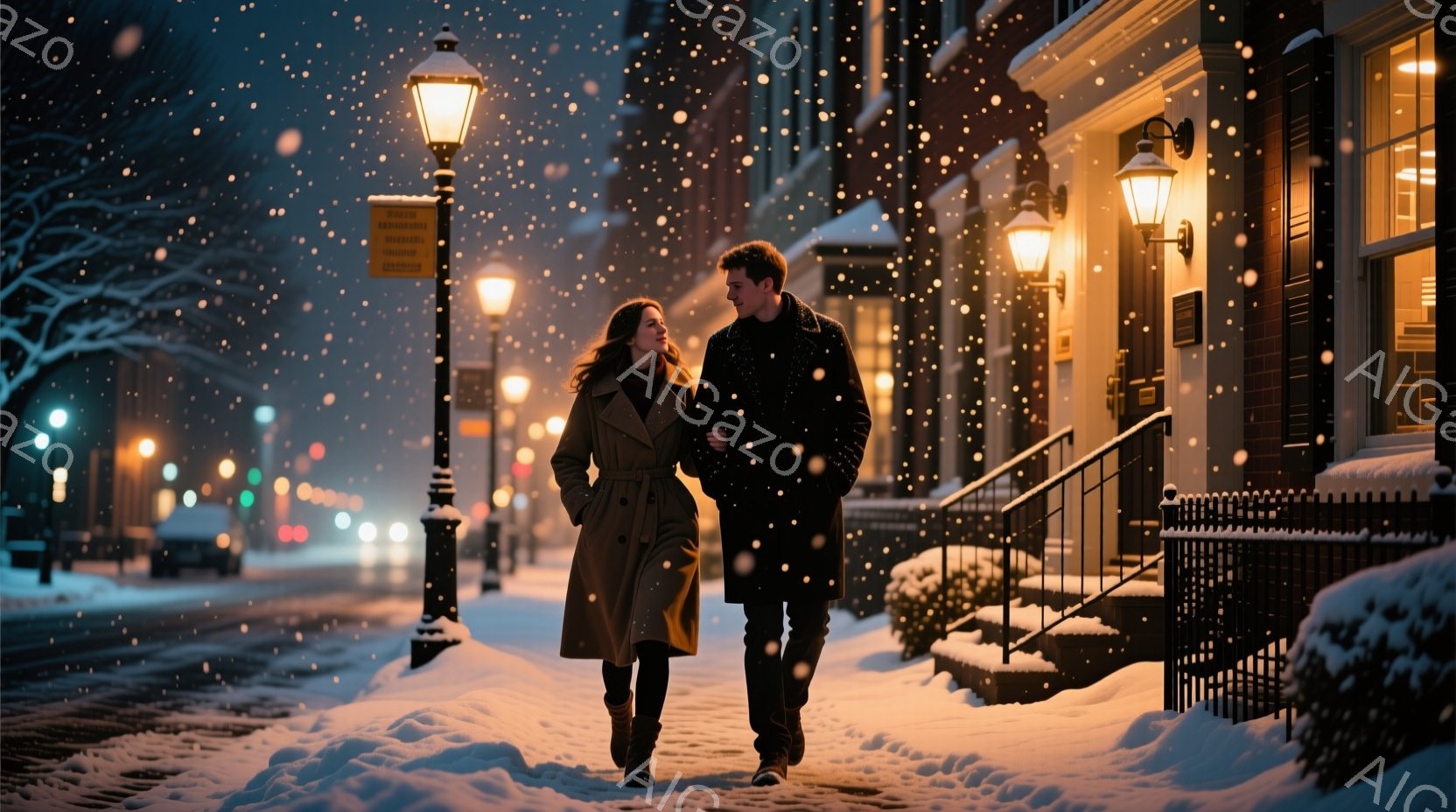雪が降る夜の街並みを、若い男女が手をつないで歩いている。男性は黒のコートにジーンズ、女性はベージュのコートにブーツを履き、それぞれ温かい服装をしている。背景には雪で覆われた建物と、灯りのついた街灯があり、ロマンチックで穏やかな雰囲気を醸し出している。