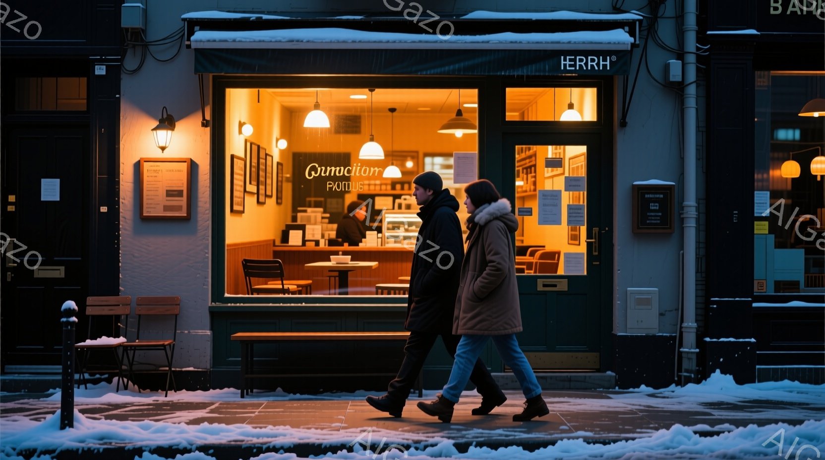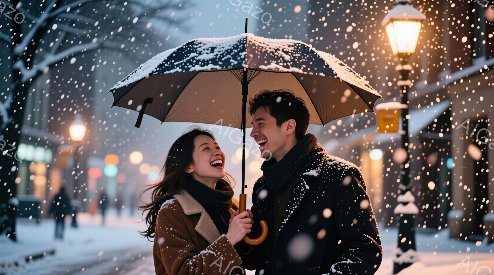 雪が降る街中で、若い男女が寄り添って笑っている。女性は茶色のコートに長い髪、男性は黒いコートにマフラーを巻いており、二人は傘の下で互いに顔を見合わせている。背景には、雪に覆われた建物や街灯があり、全体的に温かく幸せな雰囲気が漂っている。