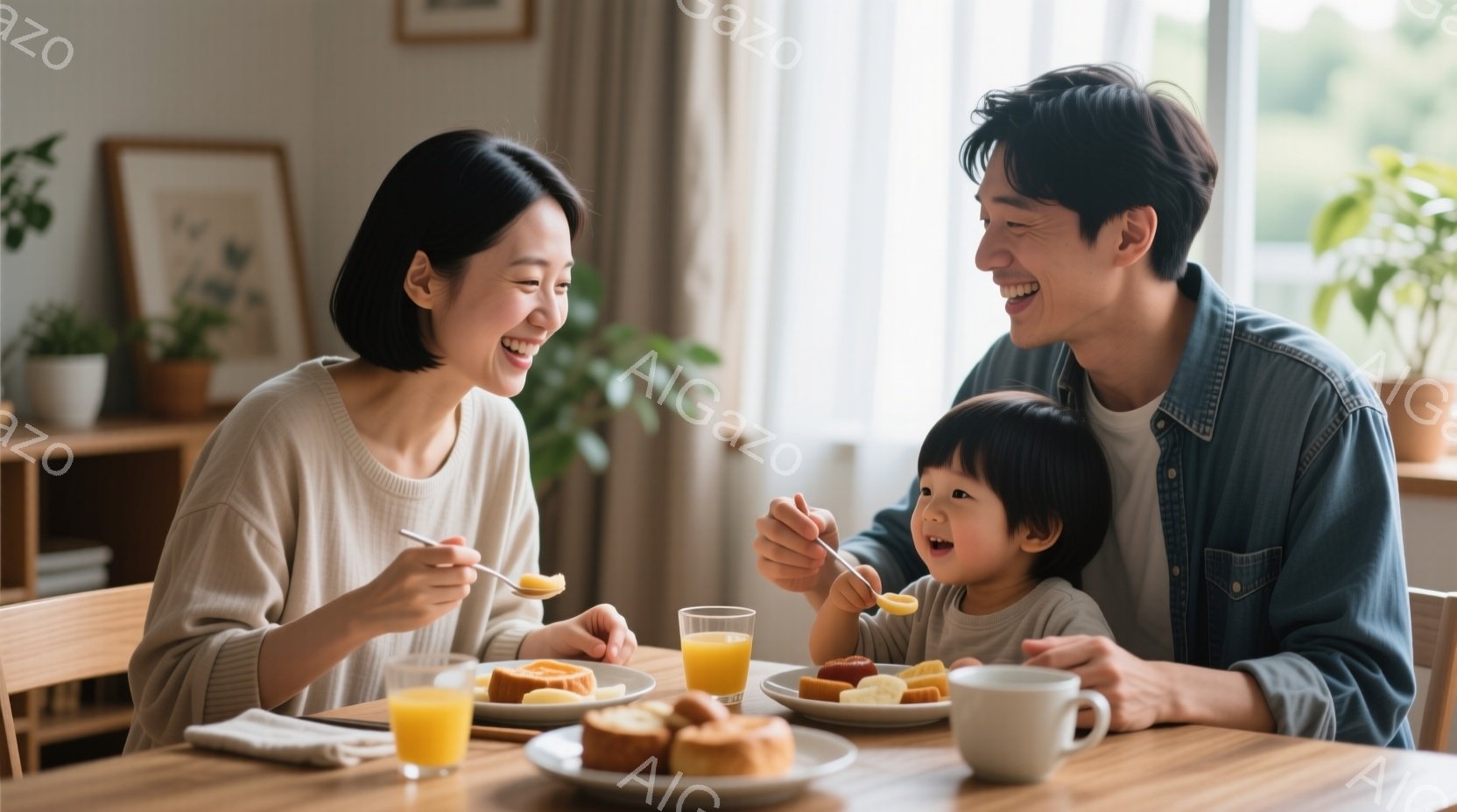 室内で、若い夫婦と幼い娘が床に座って楽しそうにしている様子が写っている。父親は緑色のシャツを着て、娘と手をつないで笑っており、母親は白いセーターを着て、満面の笑みを浮かべている。背景には木製のキャビネットやソファ、そして柔らかい光が差し込む窓が見え、全体的に温かく幸せな家庭の雰囲気が漂っている。