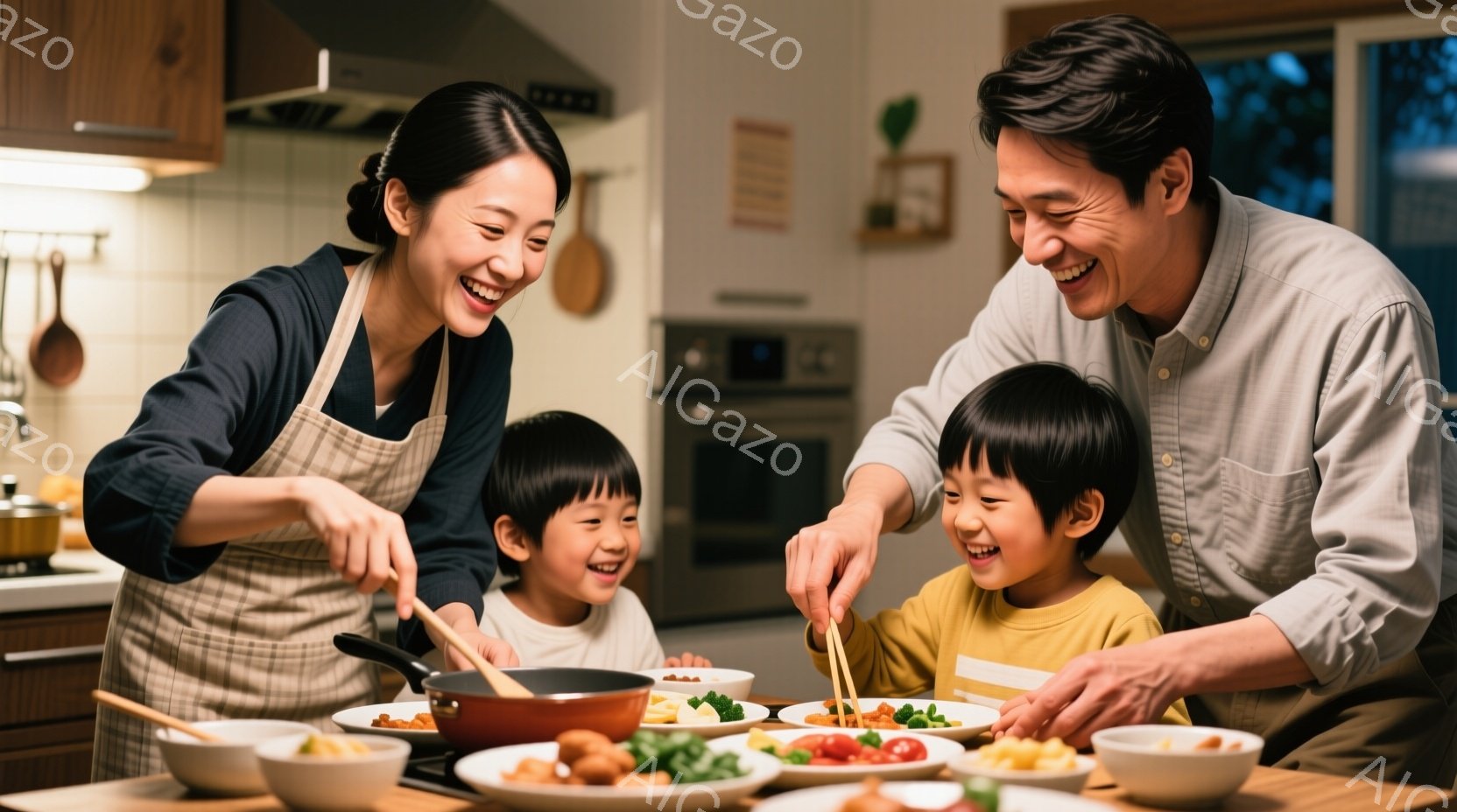 この無料AI生成画像「暖かいキッチンで、エプロンを着た女性がフライパンで料理を作り、笑顔の少年がテーブルに座って楽しみに待っています。女性はチェック柄のシャツを着ており、少年はグレーのTシャツを着ています。背景には冷蔵庫や調理器具があり、家庭的な温かい雰囲気が漂っています。」は、2025年11月08日に作成されました。 サイズは 1664×928px の高解像度で、商用利用も可能なフリー素材として提供しています。