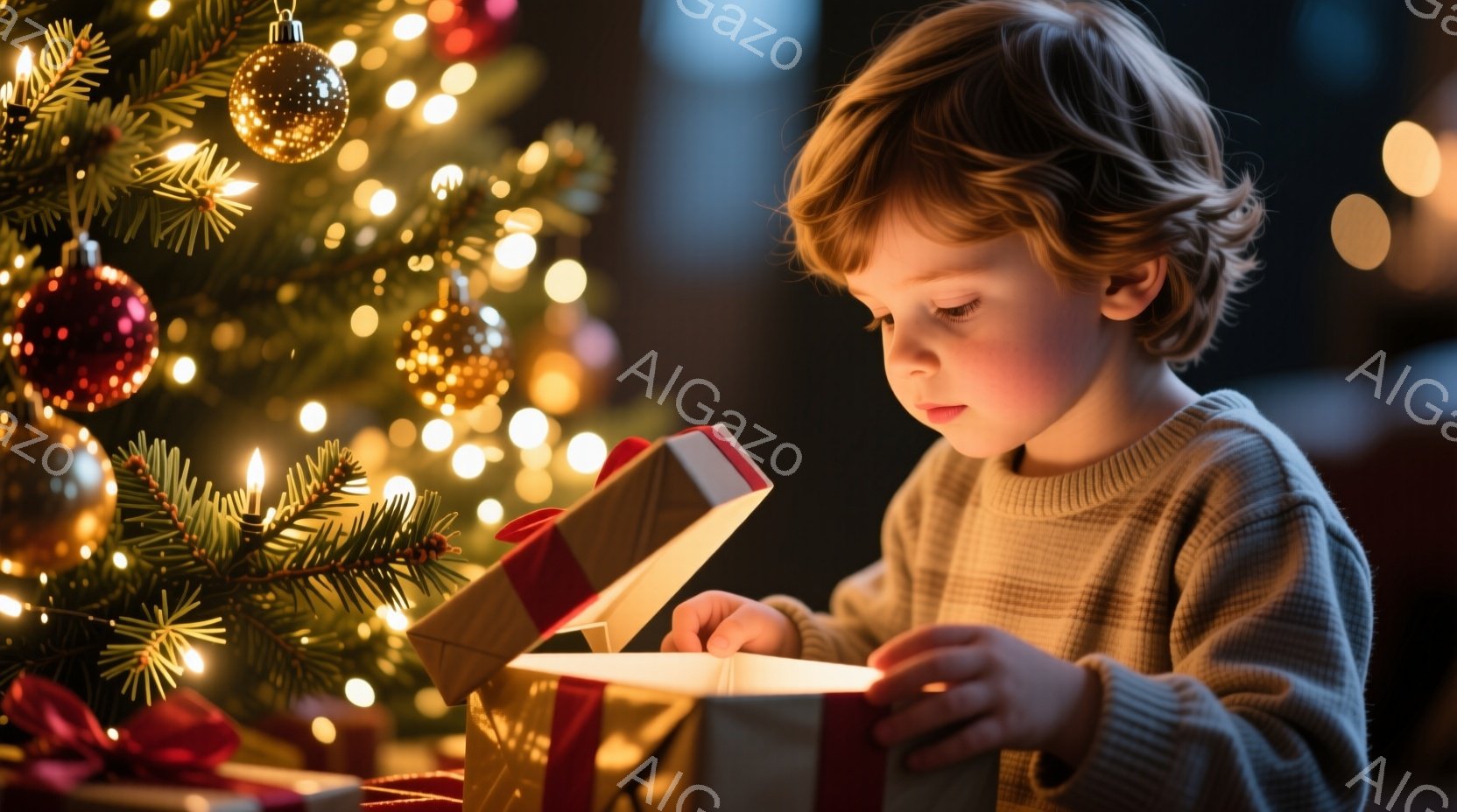 母親と父親が、ラッピングされたプレゼントを前にした幼い息子と向き合っている。母親はベージュのセーターを着て微笑んでおり、父親は濃いグレーのシャツを着て優しい表情をしている。背景にはぼやけたクリスマスツリーのライトが見え、温かく幸せな雰囲気が漂っている。