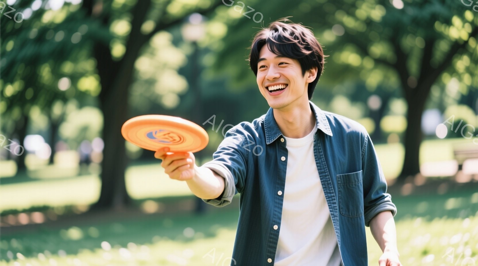 若い男性がフリスビーを投げようとしており、白いTシャツにデニムシャツを着ています。彼は笑顔で、少し髪が伸びた自然なヘアスタイルをしています。背景には緑豊かな公園と木々が見え、晴れた日の穏やかな雰囲気が伝わってきます。