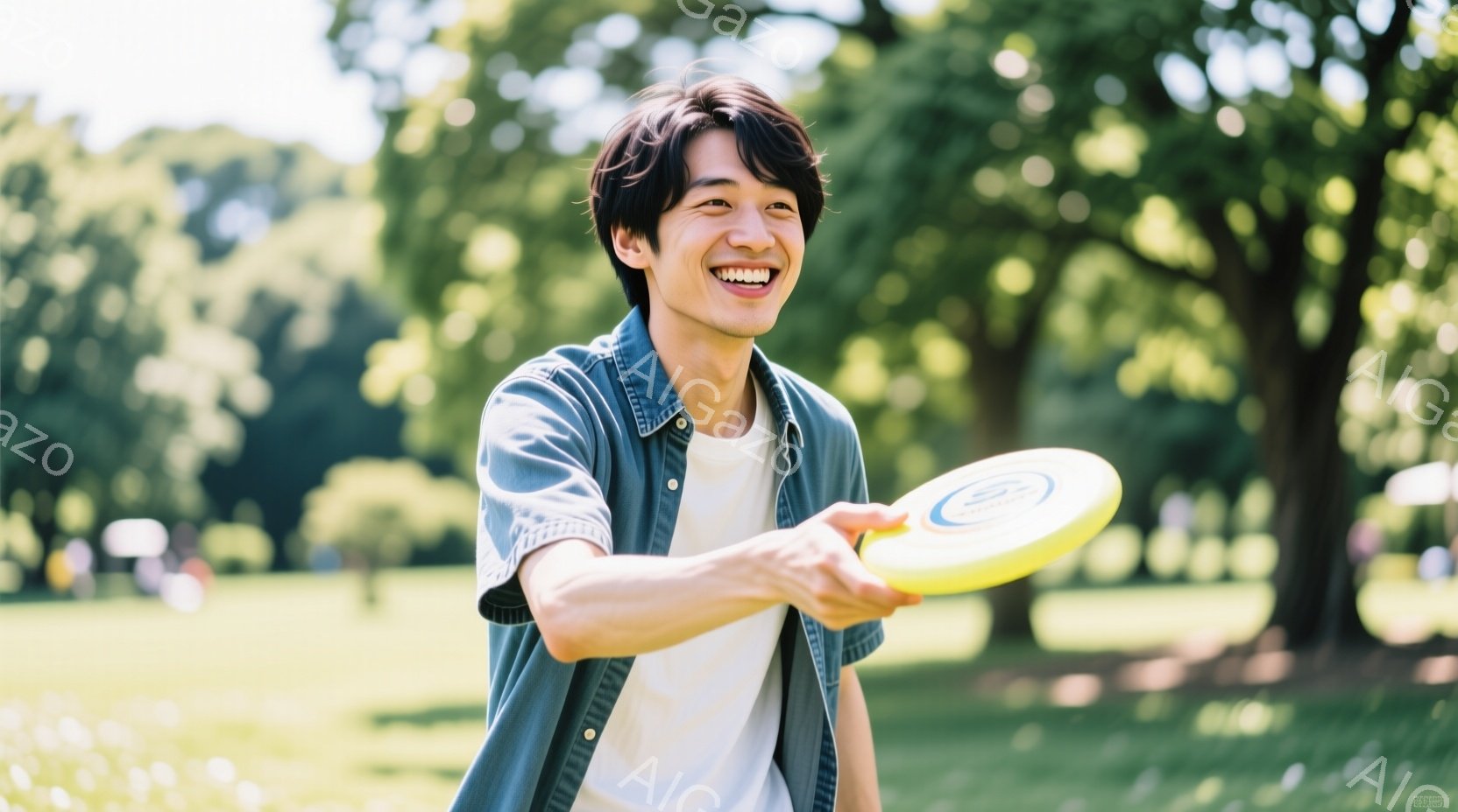 若い男性が芝生の公園でフリスビーを投げているところを捉えた写真です。彼は白いTシャツに濃い青色のシャツを着ており、短く、スタイリッシュな髪型で、満面の笑みを浮かべています。背景には緑豊かな木々が生い茂り、晴れた日の穏やかな雰囲気が伝わってきます。