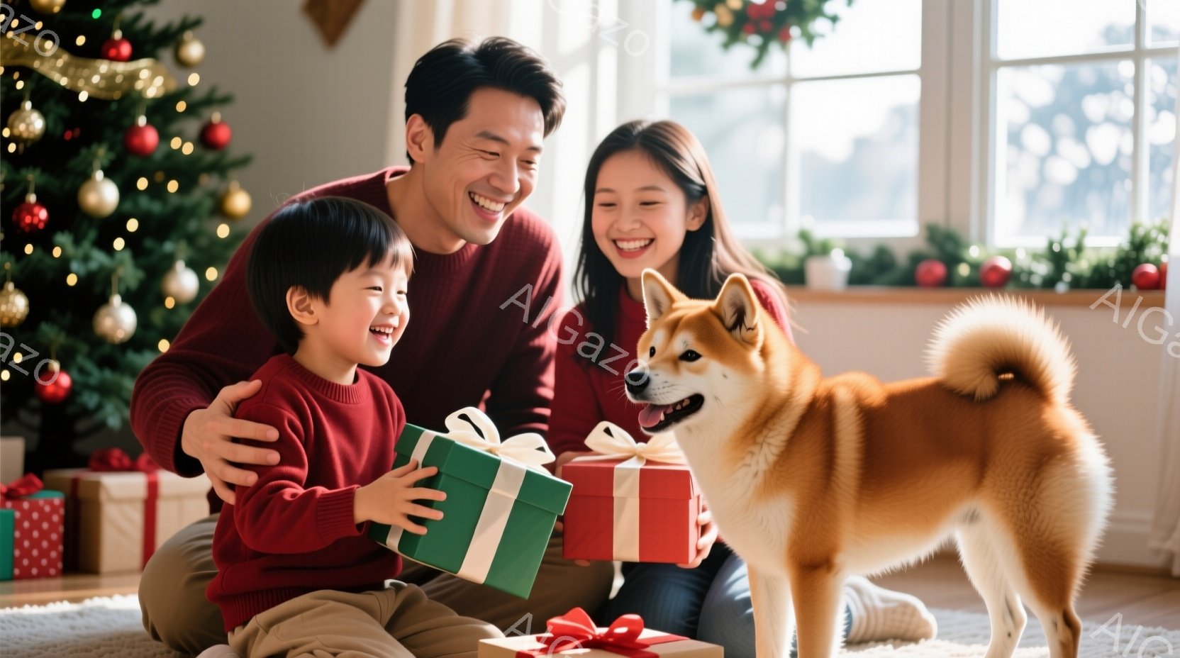 幼い娘と息子が、クリスマスプレゼントを抱えて床に座り、笑顔でシバ犬を見つめている。父親は二人の横に膝をつき、優しく見守っている。背景にはクリスマスツリーが飾られ、暖かく幸せな家庭の雰囲気が漂っている。