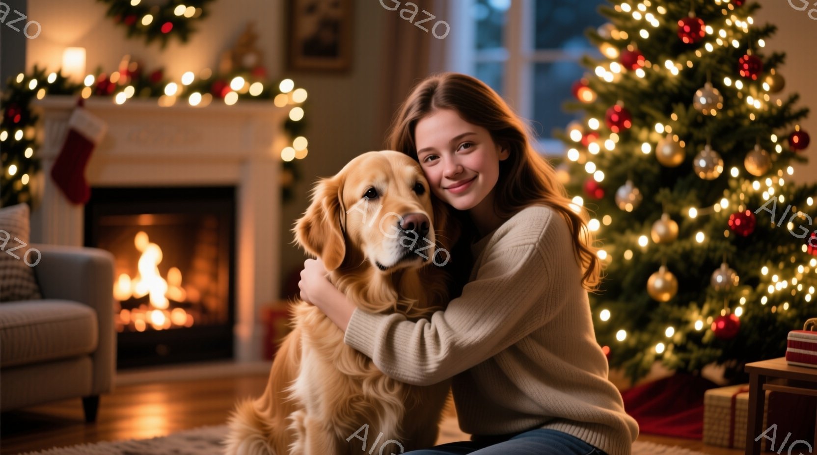 長い茶色の髪をした若い女性が、ゴールデンレトリバーを抱きしめて座っています。彼女はセーターを着ており、目を閉じて穏やかな笑顔を浮かべています。背景にはクリスマスツリーが飾られ、暖炉の火が暖かく光っており、温かく、居心地の良い家庭的な雰囲気が漂っています。