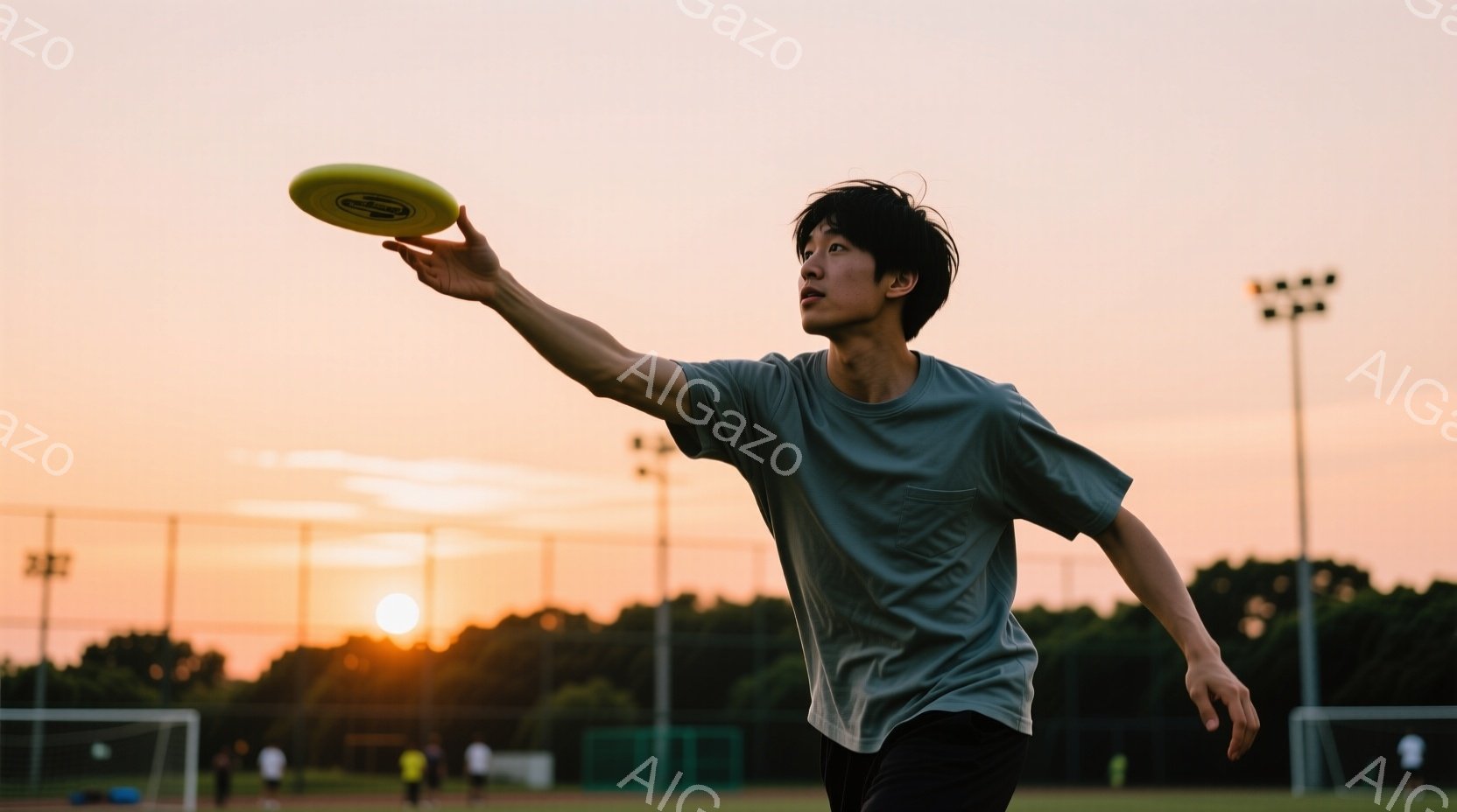 白いTシャツと黒いズボンを身につけた若い男性が、フリスビーを投げる動作をしています。彼の髪は短く、やや前傾姿勢で、夕焼けを背景に力強い印象を与えています。背景には緑豊かな木々やサッカーゴール、そしてオレンジ色に輝く夕焼け空が広がっており、穏やかでアクティブな雰囲気を醸し出しています。
