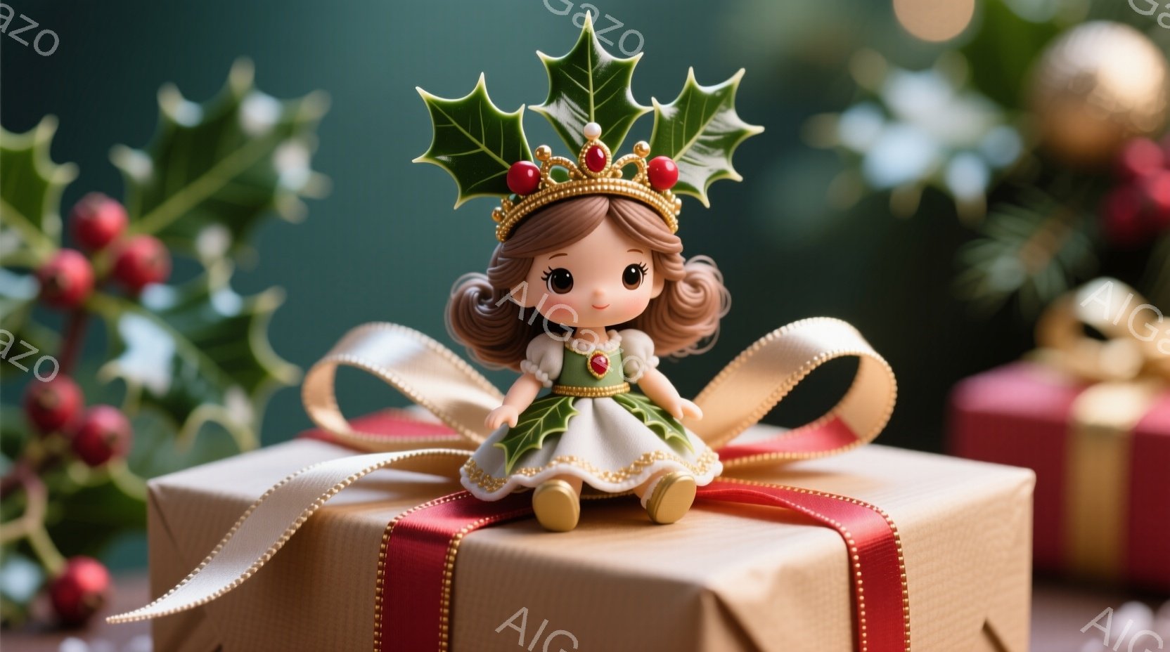 ピンク色のドレスを着た小さな女の子の人形が、プレゼントのようにラッピングされた箱の上に立っています。彼女はカールした茶色の髪で、頭には赤い宝石があしらわれた冠を戴いています。背景には、赤い実の付いた葉やぼやけたクリスマスオーナメントが見え、全体的に華やかで温かい雰囲気が漂っています。