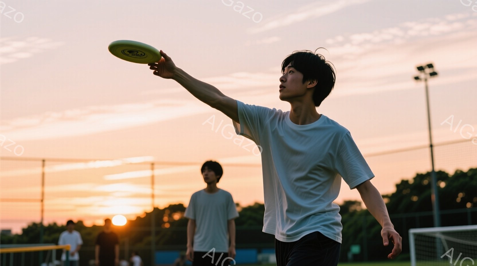 若い男性がフリスビーを投げている姿が捉えられています。彼はグレーのTシャツと黒いズボンを着用し、少し長めの髪を無造作にしています。背景には夕焼け空と、サッカーゴール、そして他の人影が見え、爽やかで活動的な雰囲気が漂っています。