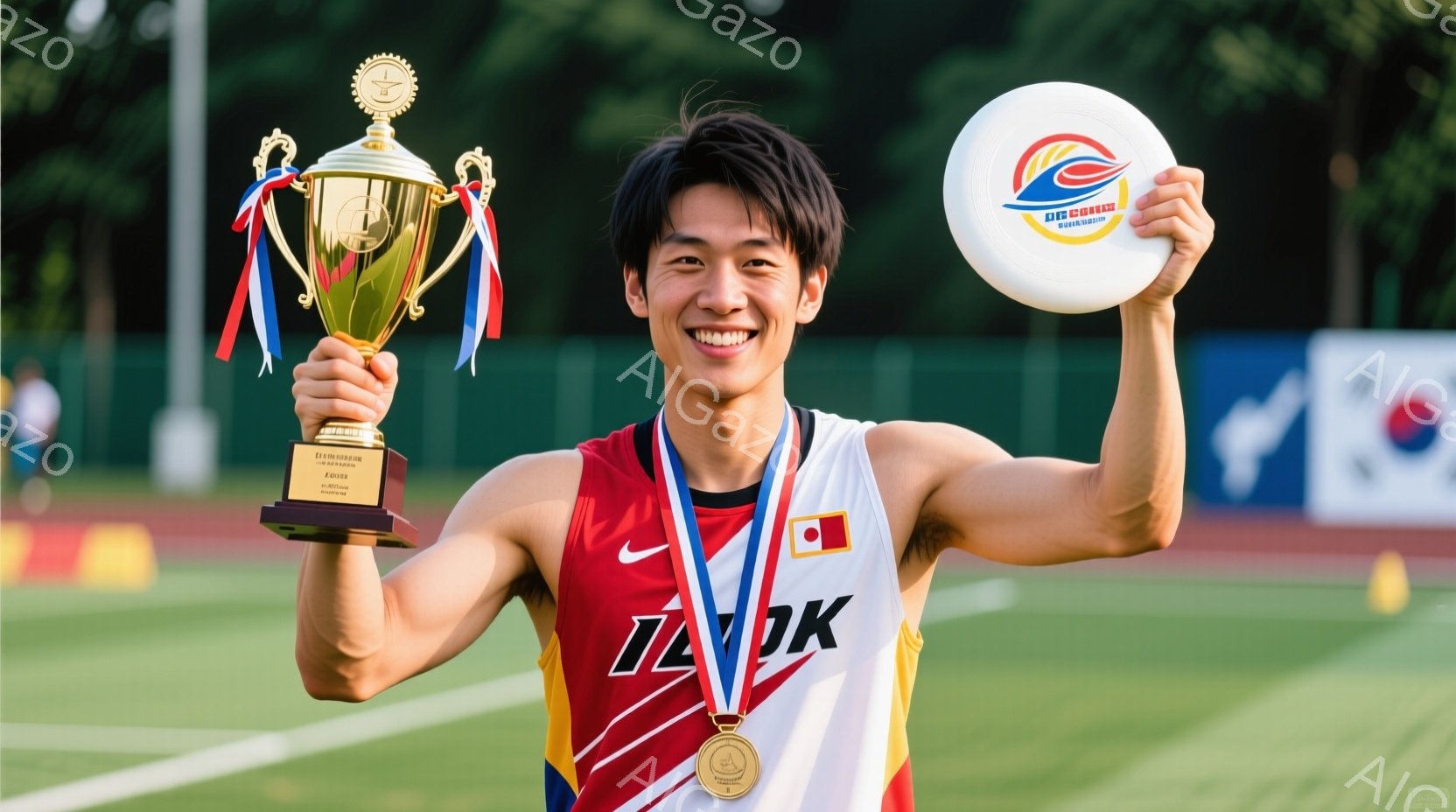 この無料AI生成画像「競技者が表彰台で勝利を喜び、片手にトロフィー、もう片手に黄色いスポンジボールを持っています。彼は赤いタンクトップと黒いショーツを着用し、首には金色のメダルとリボンがかけられています。背景には「2013」と書かれた看板が見え、晴天の下、競技場の雰囲気が伝わってきます。」は、2025年10月22日に作成されました。 サイズは 1664×928px の高解像度で、商用利用も可能なフリー素材として提供しています。