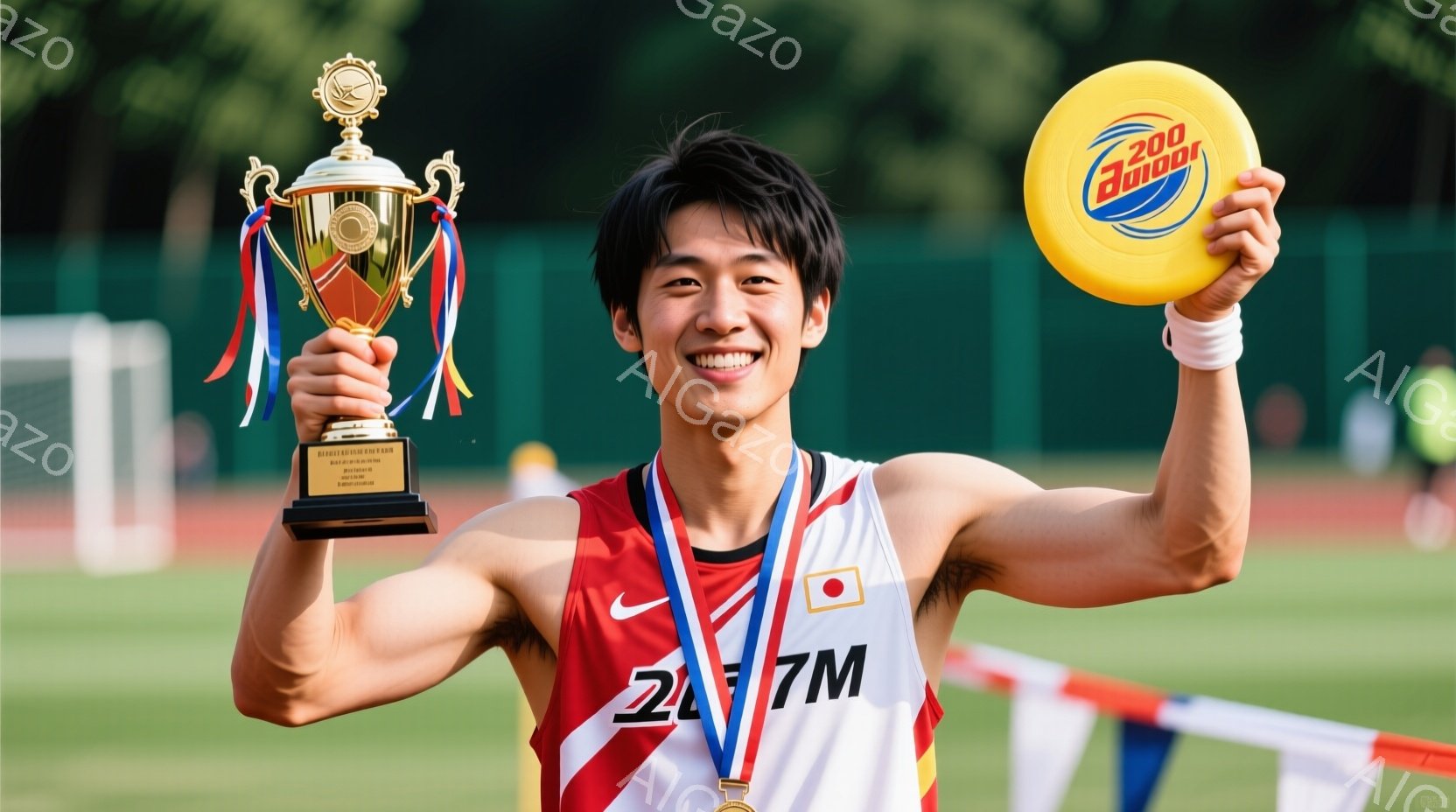 競技場を背景に、日本の選手が優勝トロフィーと黄色いボールを高く掲げて喜んでいます。彼は黒のランニングウェアに赤いラインと日本の国旗のマークが入っており、短髪で笑顔を見せています。背景には観客席と緑の芝生、そして晴天の空が広がっており、勝利の喜びと活気に満ちた雰囲気が伝わってきます。