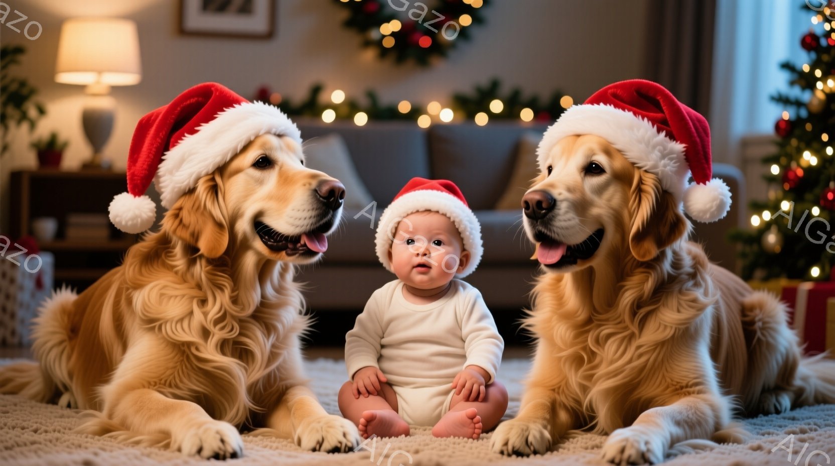 赤いサンタ帽をかぶった2匹のゴールデンレトリバーと、同じくサンタ帽をかぶった赤ちゃんが、白いカーペットの上に座って正面を見ている。背景にはクリスマスツリーの光と、ぼんやりと見える家具があり、温かく穏やかな家庭の雰囲気が漂っている。赤ちゃんの穏やかな表情と、犬たちのリラックスした姿勢が、ほほえましい光景を作り出している。