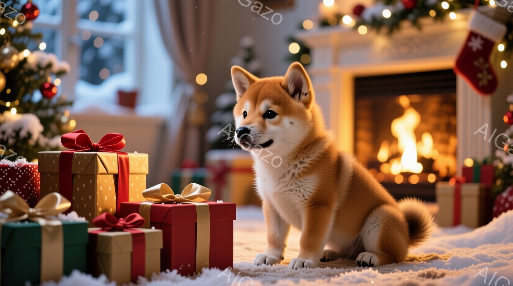 柴犬が赤い敷物の上で座っており、その表情は穏やかで少しどこかを見つめているようです。背景にはクリスマスツリーと暖炉があり、暖炉の炎が優しく灯っています。プレゼントボックスがいくつか並べられており、全体的に温かく、クリスマスの雰囲気が漂う、心地よい光景です。