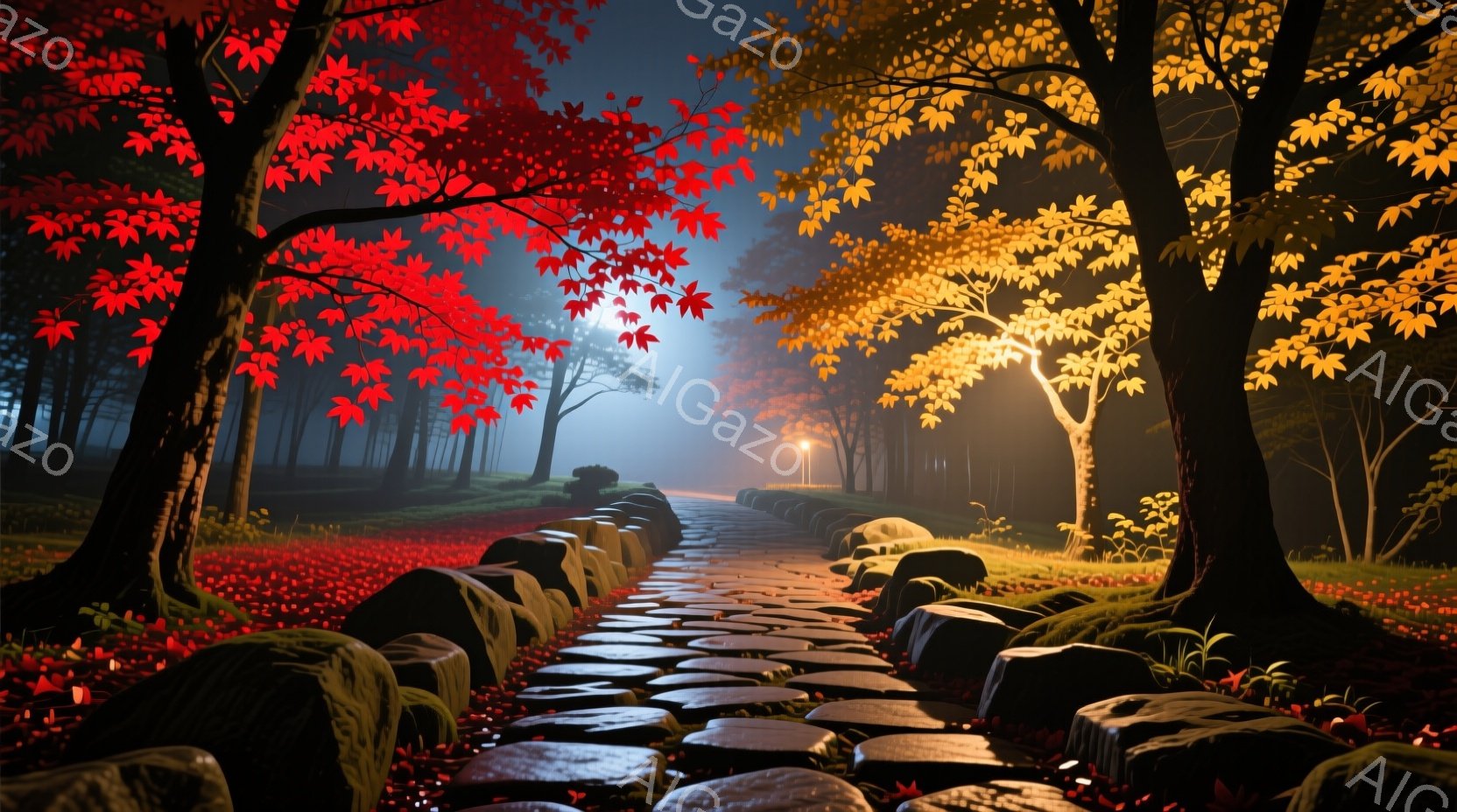 赤や黄色の紅葉に彩られた庭園の石畳の道が、霧の中に消えていく様子が描かれている。道沿いには手入れされた低木があり、背景には鬱蒼とした木々が立ち並び、全体的に静寂で幻想的な雰囲気が漂っている。鮮やかな色彩と霧の効果が、秋の深まりを感じさせる美しい情景を作り出している。
