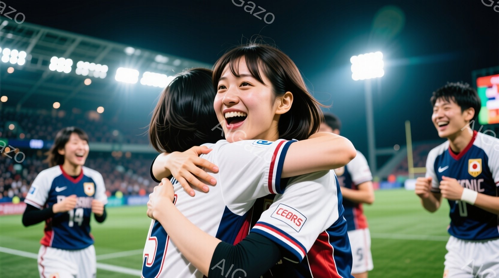 サッカーの試合後、日本の女子選手たちが喜びを分かち合って抱き合っている様子が写っている。選手たちは白を基調としたユニフォームに、赤いラインと青い袖が特徴的なデザインで、髪型はポニーテールやショートヘアだ。背景には観客席がぼやけており、照明が明るく、勝利の興奮と感動に満ちた雰囲気が伝わってくる。