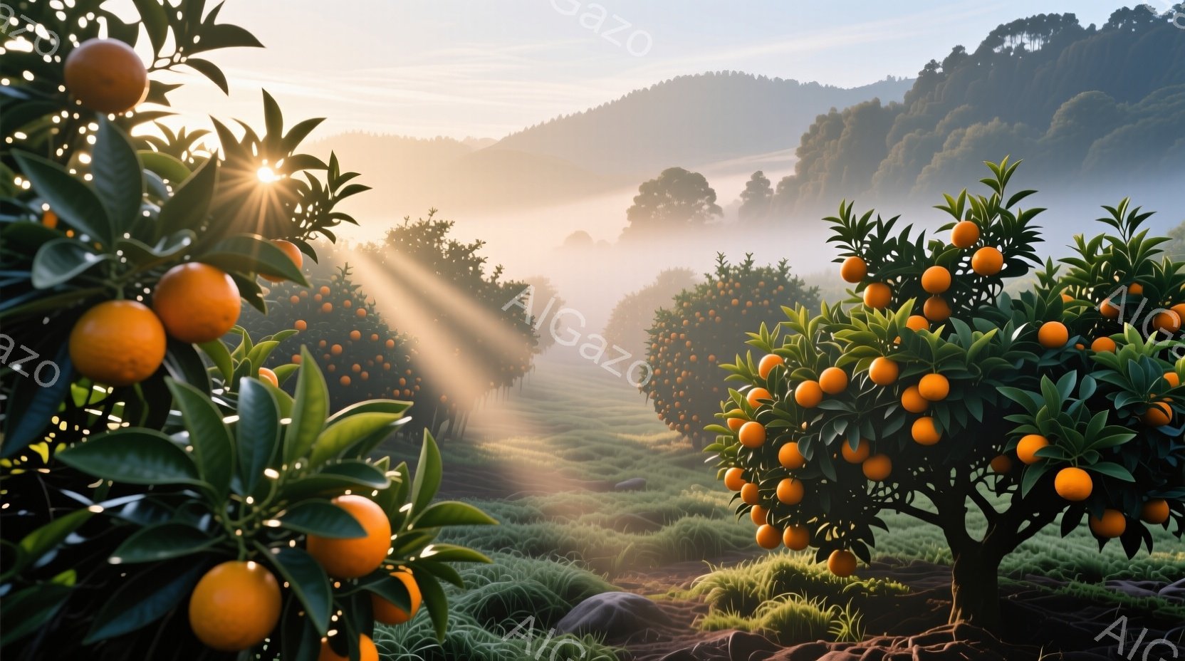 鮮やかなオレンジ色の実をつけた柑橘類の木々が密集しており、その葉は緑豊かで、朝日に照らされています。背景には霧のかかった丘陵地帯が広がり、柔らかな光が木々の間から差し込み、穏やかで牧歌的な雰囲気を醸し出しています。全体的に暖かく、自然豊かな風景が印象的です。