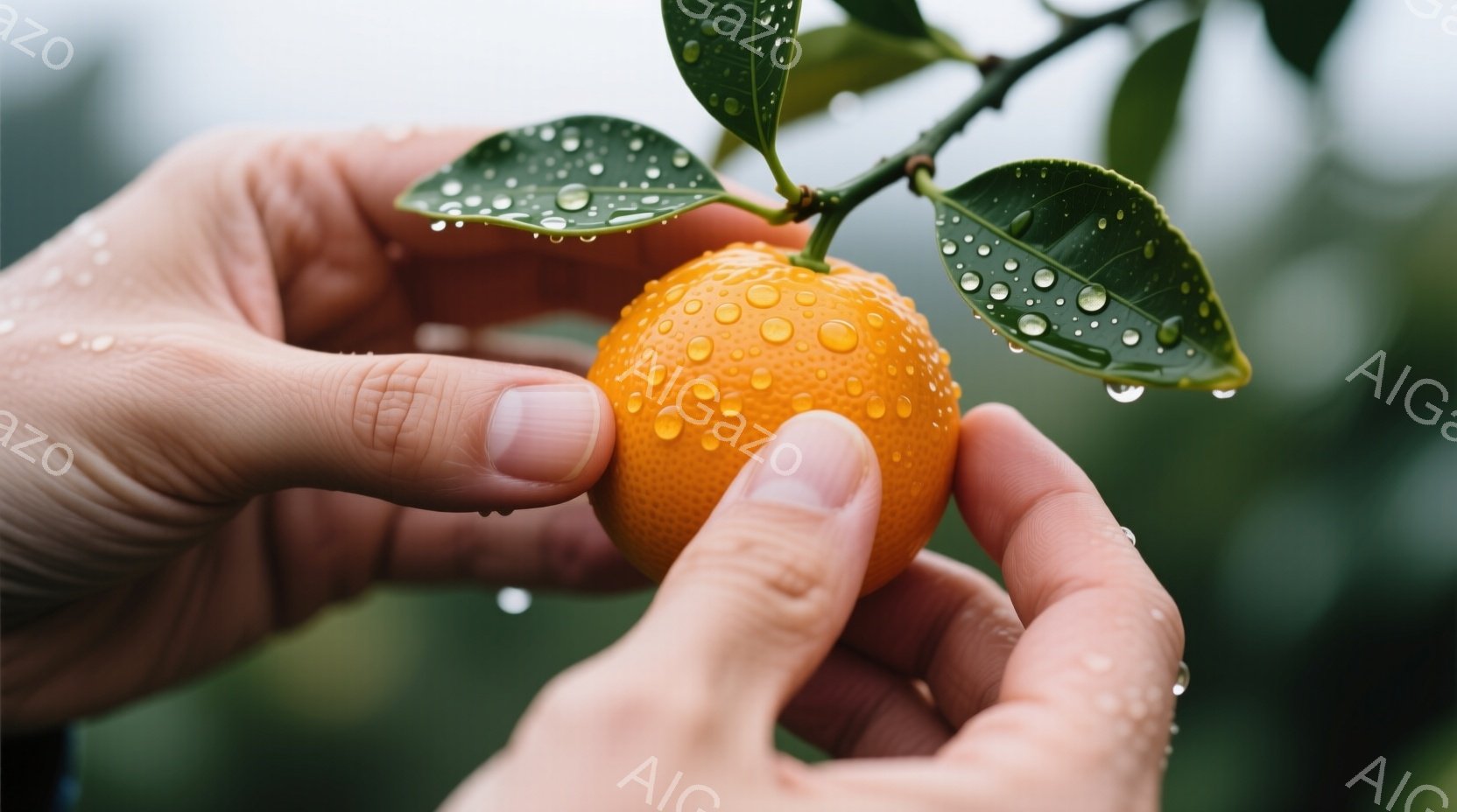 みずみずしいオレンジ色の柑橘類が、緑の葉が付いた枝から手によって摘み取られている様子が写っています。手は皺があり、経験を感じさせ、柑橘類には雨粒が輝いており、収穫の直後の新鮮さを強調しています。背景は緑豊かで、雨上がりの自然を感じさせ、全体的に穏やかで収穫の喜びを表現しています。