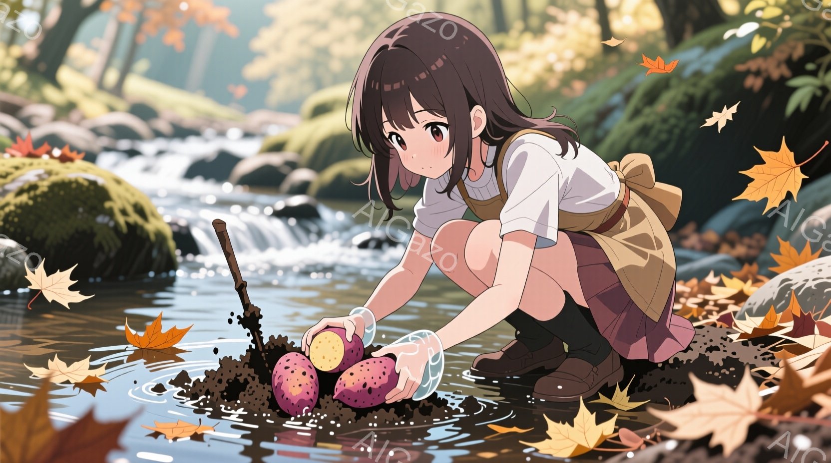 広大な畑には紫色のサツマイモが実り、緑の葉と蔓が土の上を這っている。背景には、瓦屋根の伝統的な家屋が点在し、秋の黄金色に輝く田園風景が広がり、穏やかで温かい雰囲気を醸し出している。空は晴れ、秋の光が畑全体を照らし、収穫の喜びを感じさせる。