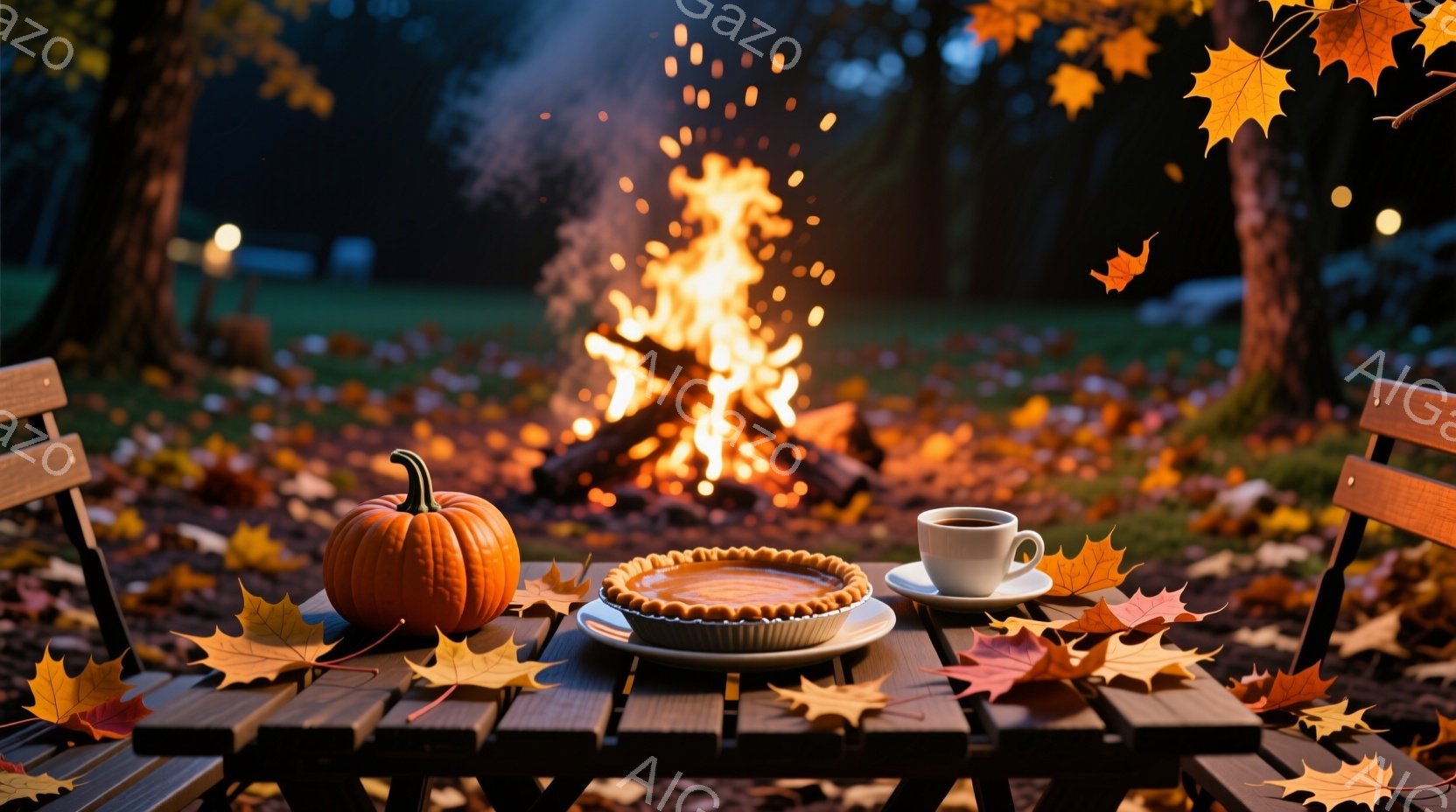 秋の夕暮れを思わせる光景で、木製のピクニックテーブルの上に、切りかけのパンプキンパイ、コーヒーカップ、小さなカボチャが並べられています。テーブルの周りや地面には落ち葉が散らばり、背景には暖炉の炎と暗い森が見え、穏やかで温かい雰囲気を醸し出しています。落ち葉と炎のオレンジ色が、秋らしさを強調し、静寂の中に温もりを感じさせる情景です。