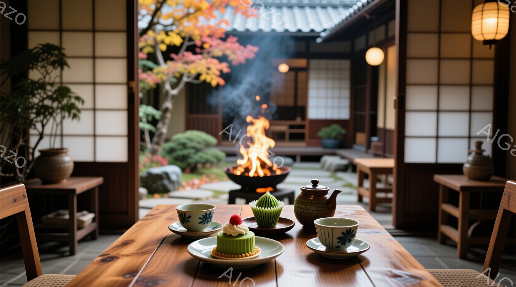 畳敷きの縁側から見える庭には、燃え盛る炉があり、紅葉が鮮やかに彩られています。木製のテーブルの上には、緑色のケーキと湯呑みが置かれ、ほっとするティータイムを予感させます。全体的に落ち着いた色調と庭の自然が調和し、穏やかで優雅な雰囲気を醸し出しています。