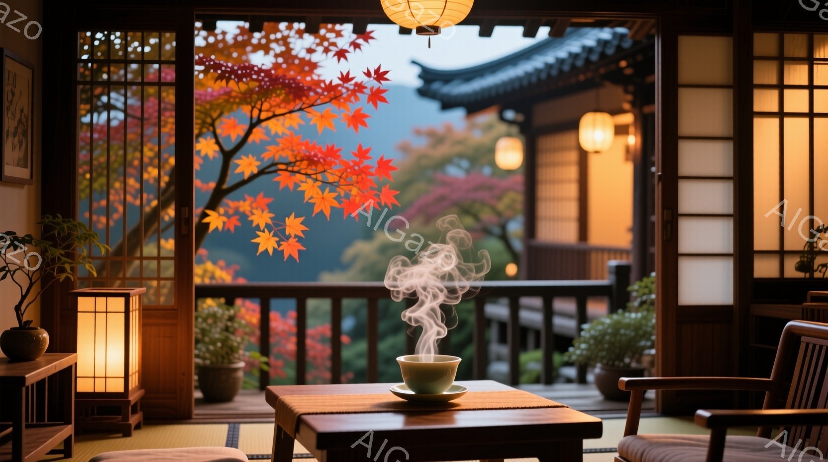 窓の外には鮮やかな紅葉が広がり、日本の伝統的な家屋が見える。室内には木製のテーブルがあり、湯気が立ち上る緑色の茶碗が置かれている、落ち着いた雰囲気が漂う和室だ。暖色の照明と自然光が相まって、静かで穏やかな空間を作り出している。