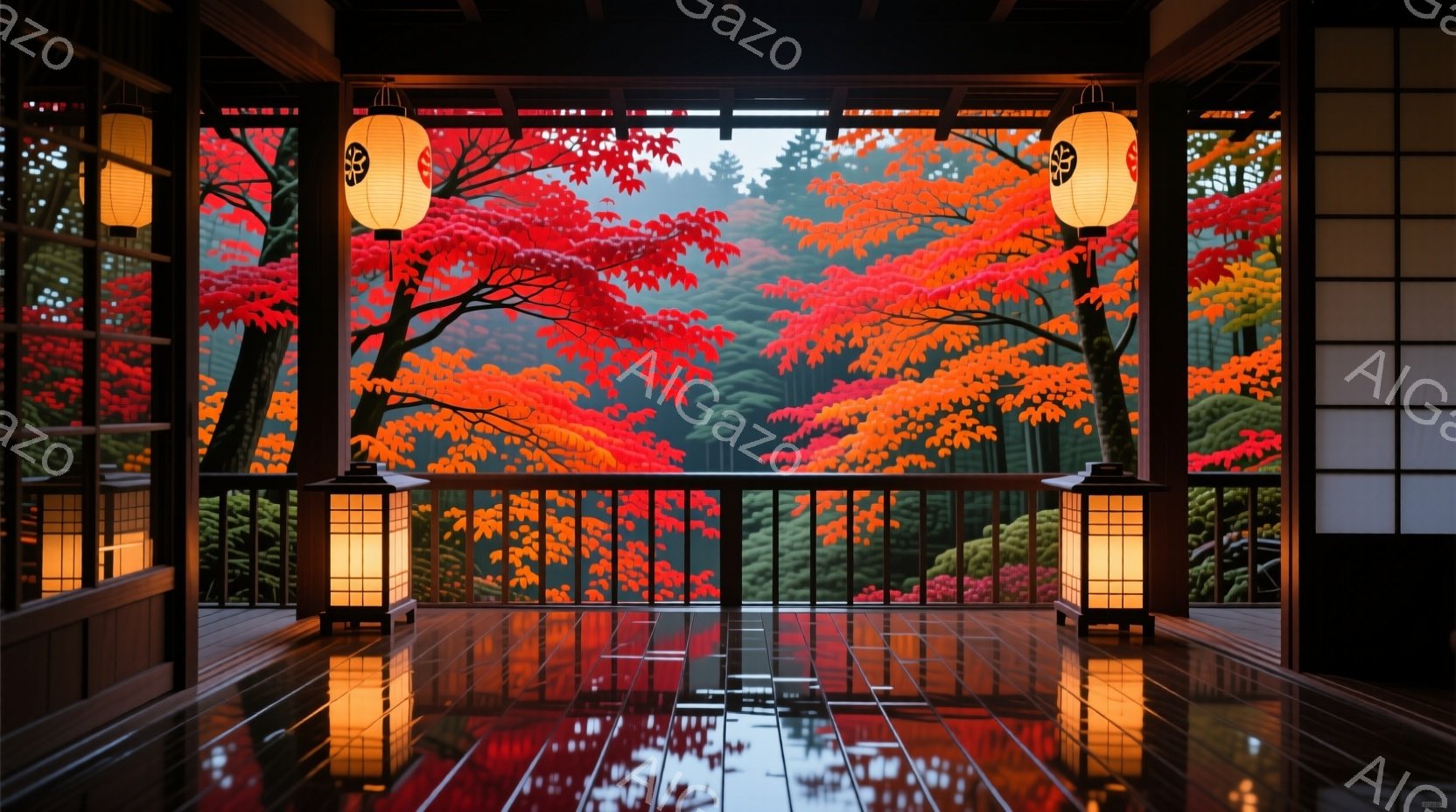 広々とした木造の部屋で、障子戸が開け放たれ、鮮やかな紅葉の景色が見渡せる。床は磨かれて光沢があり、その上にランタンの光が反射し、暖かく落ち着いた雰囲気を醸し出している。全体的に秋の静寂と美しさを感じさせる、日本の伝統的な空間が描かれている。