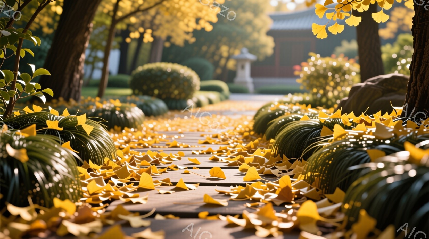 イチョウの葉が敷き詰められた遊歩道が印象的な風景です。剪定された低木が左右に整列し、奥には伝統的な様式の建物が見えます。秋の穏やかな日差しが葉を照らし、暖かく落ち着いた雰囲気を醸し出しています。