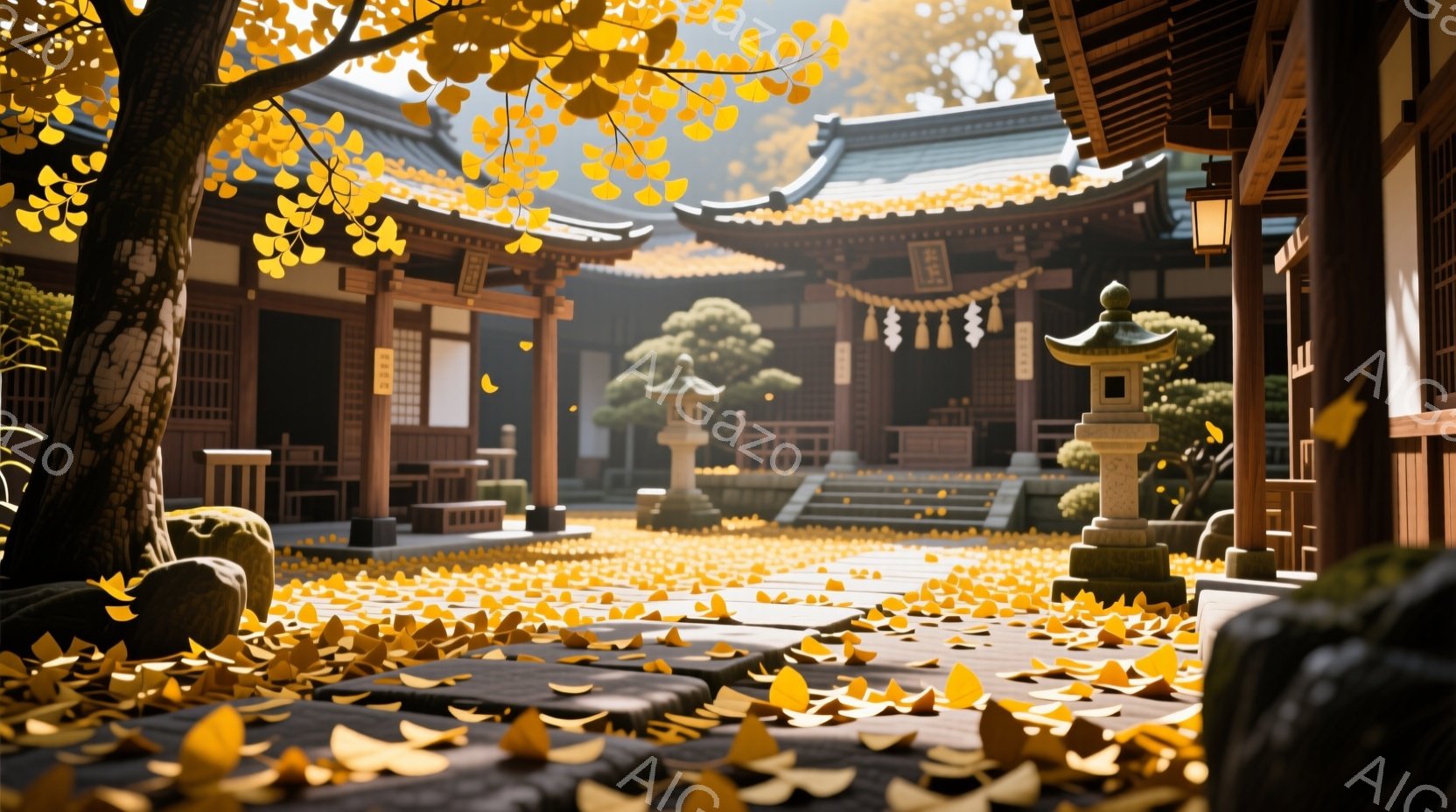この無料AI生成画像「鮮やかな紅葉の葉が敷き詰められた石段が、朱色の鳥居へと続いています。背景には苔むした石灯籠と、屋根が美しい社殿が見え、秋の深まりを感じさせます。木漏れ日が差し込み、静寂で神秘的な雰囲気が漂っています。」は、2025年11月10日に作成されました。 サイズは 1664×928px の高解像度で、商用利用も可能なフリー素材として提供しています。