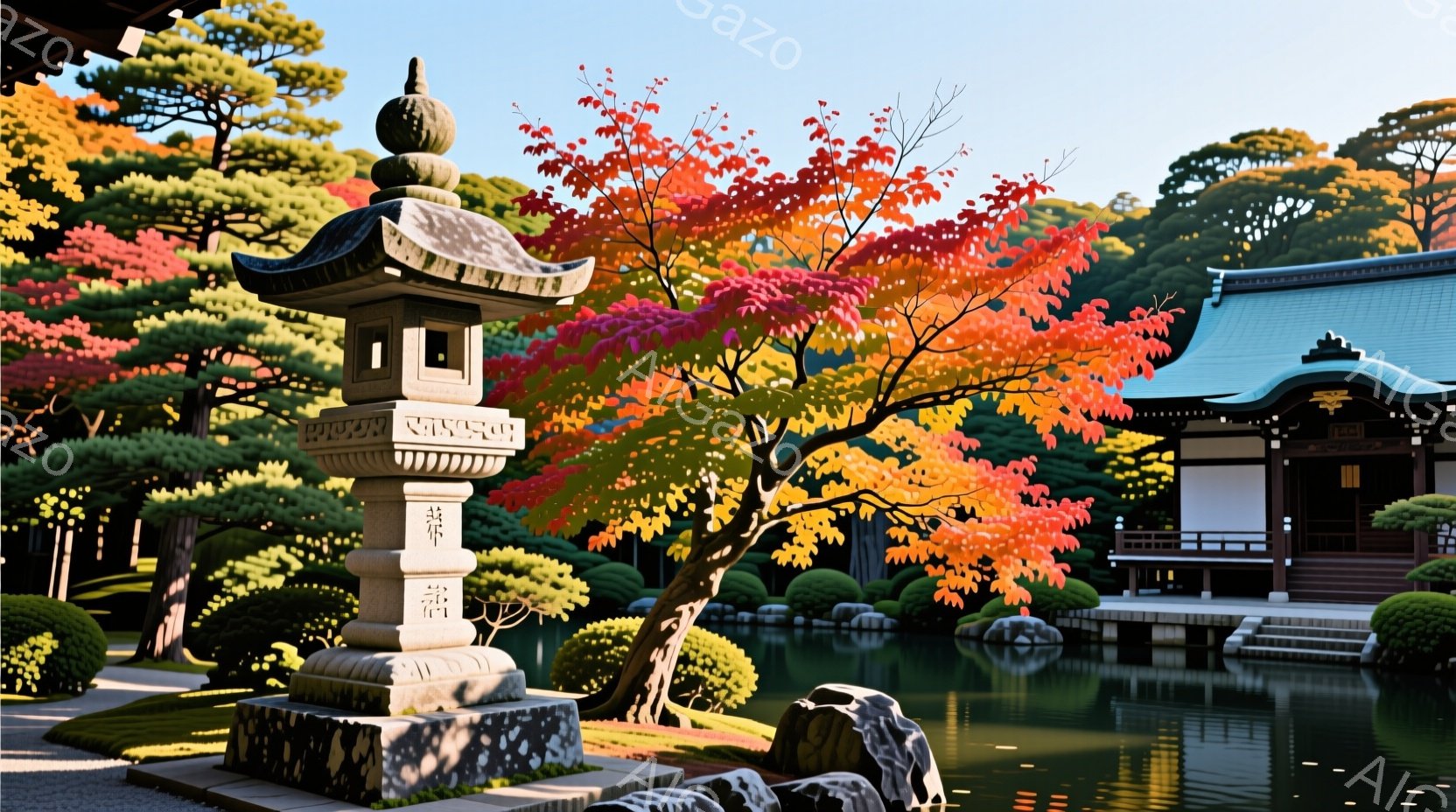 鮮やかな紅葉に囲まれた石造りの塔が、穏やかな池のほとりに佇んでいます。背景には伝統的な様式の建物が見え、緑豊かな木々が秋の色彩を一層引き立てています。静かで穏やかな雰囲気が漂い、日本の伝統的な庭園の美しさが際立っています。