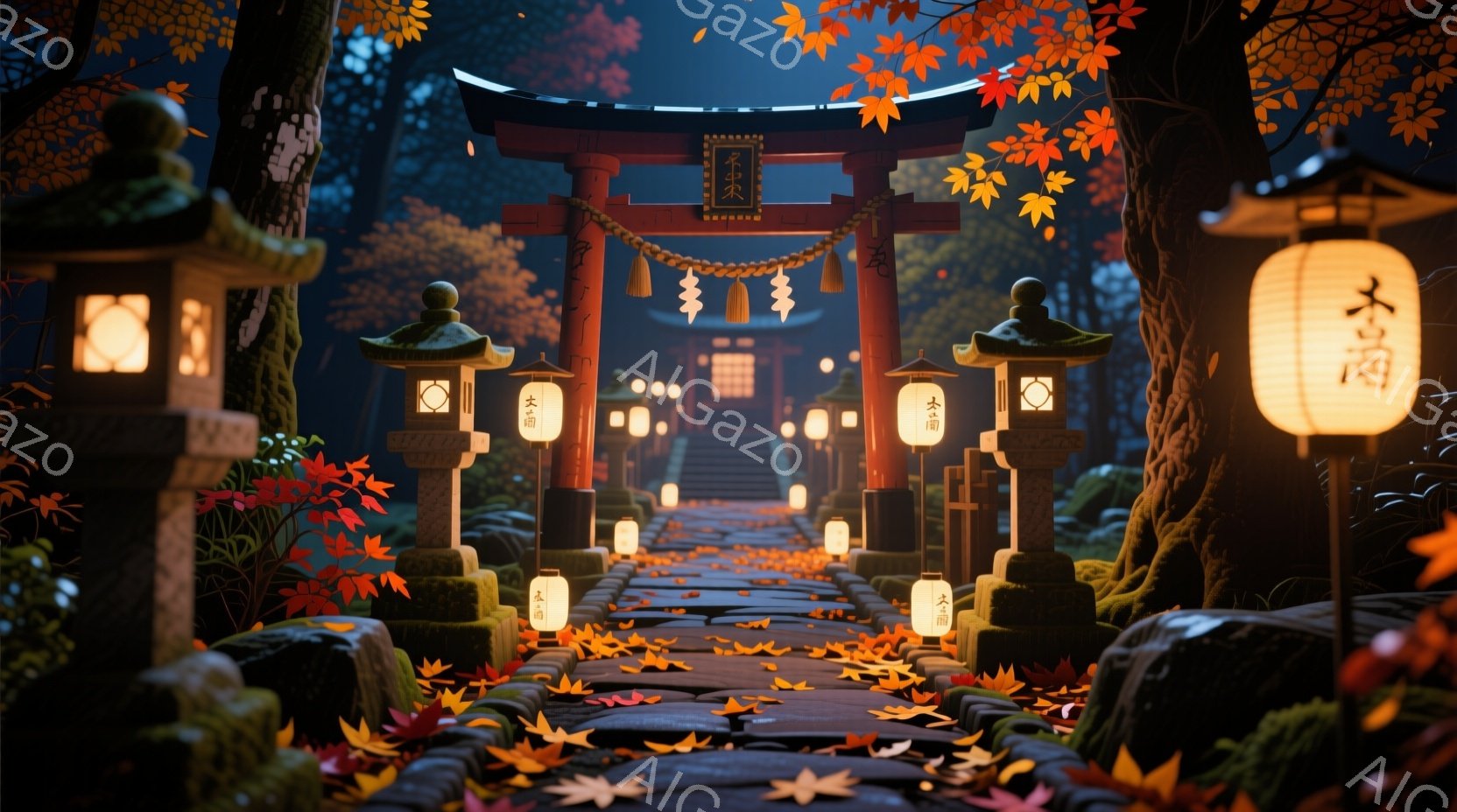 鮮やかな朱色の鳥居が並び、石畳の道へと続いています。周囲は緑豊かな木々と紅葉に覆われ、道には散り葉が舞い、幻想的な雰囲気を醸し出しています。鳥居の奥には、日本の伝統的な建物が見え、夜空には星が輝き、静寂で神秘的な空間を表現しています。