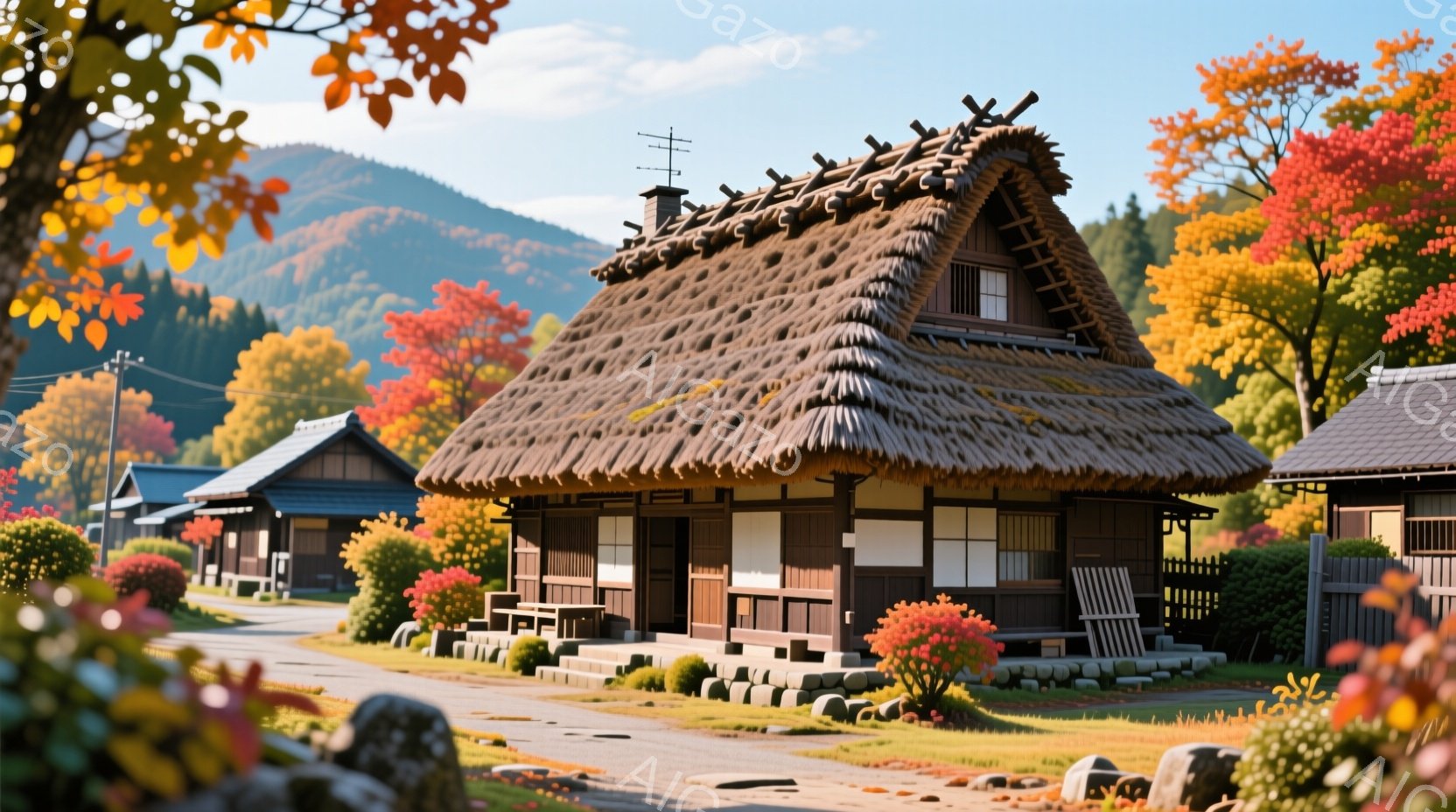 藁葺き屋根の古民家が並ぶ日本の田舎の風景です。鮮やかな紅葉の木々が背景を彩り、暖かく穏やかな秋の日の雰囲気が漂っています。石畳の道と整えられた庭が、日本の伝統的な美しさを引き立てています。