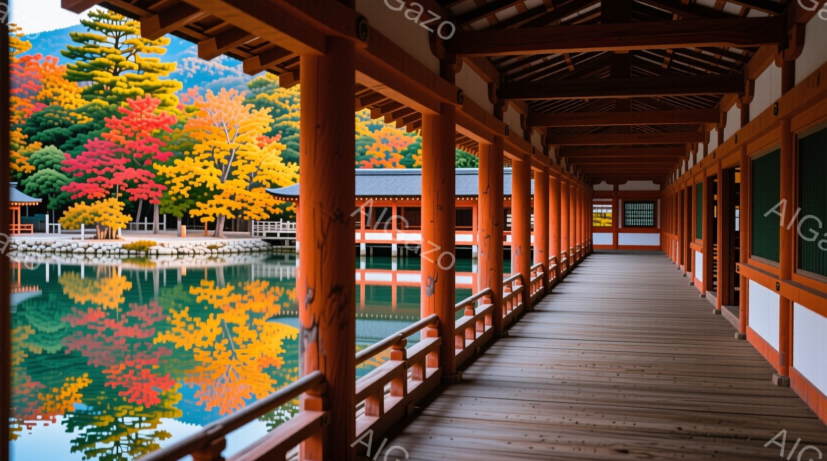 赤や黄色の紅葉が水面に映り込み、秋の色彩が鮮やかな景色が広がっています。木造の回廊は明るい日差しに照らされ、その構造美が際立っています。静寂に包まれた空間は、穏やかで落ち着いた雰囲気を醸し出しています。