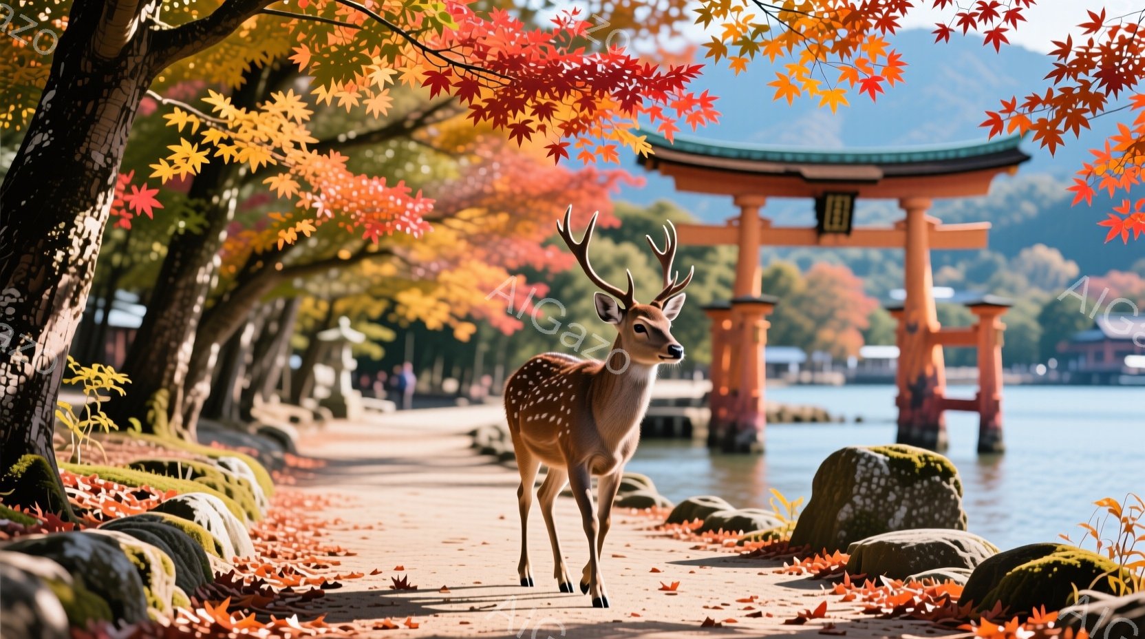 鹿が石畳の道に立っており、背景には赤い鳥居と穏やかな湖が見える。周囲は紅葉した木々で彩られ、秋の穏やかな雰囲気が漂っている。石灯籠が道の脇に立ち、歴史的な場所であることを示唆している。