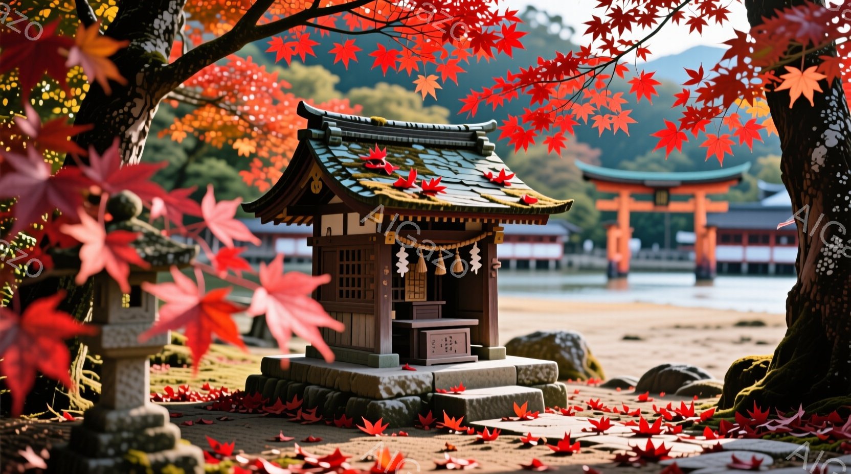 鮮やかな紅葉に囲まれた小さなお堂が印象的な写真です。朱色の大きな鳥居と、その奥に広がる水面が、秋の風景をさらに引き立てています。全体的に落ち着いた雰囲気で、日本の自然と文化が調和した美しい光景です。