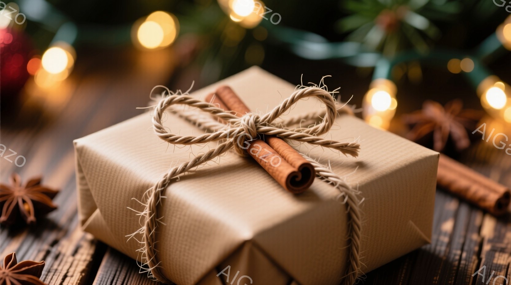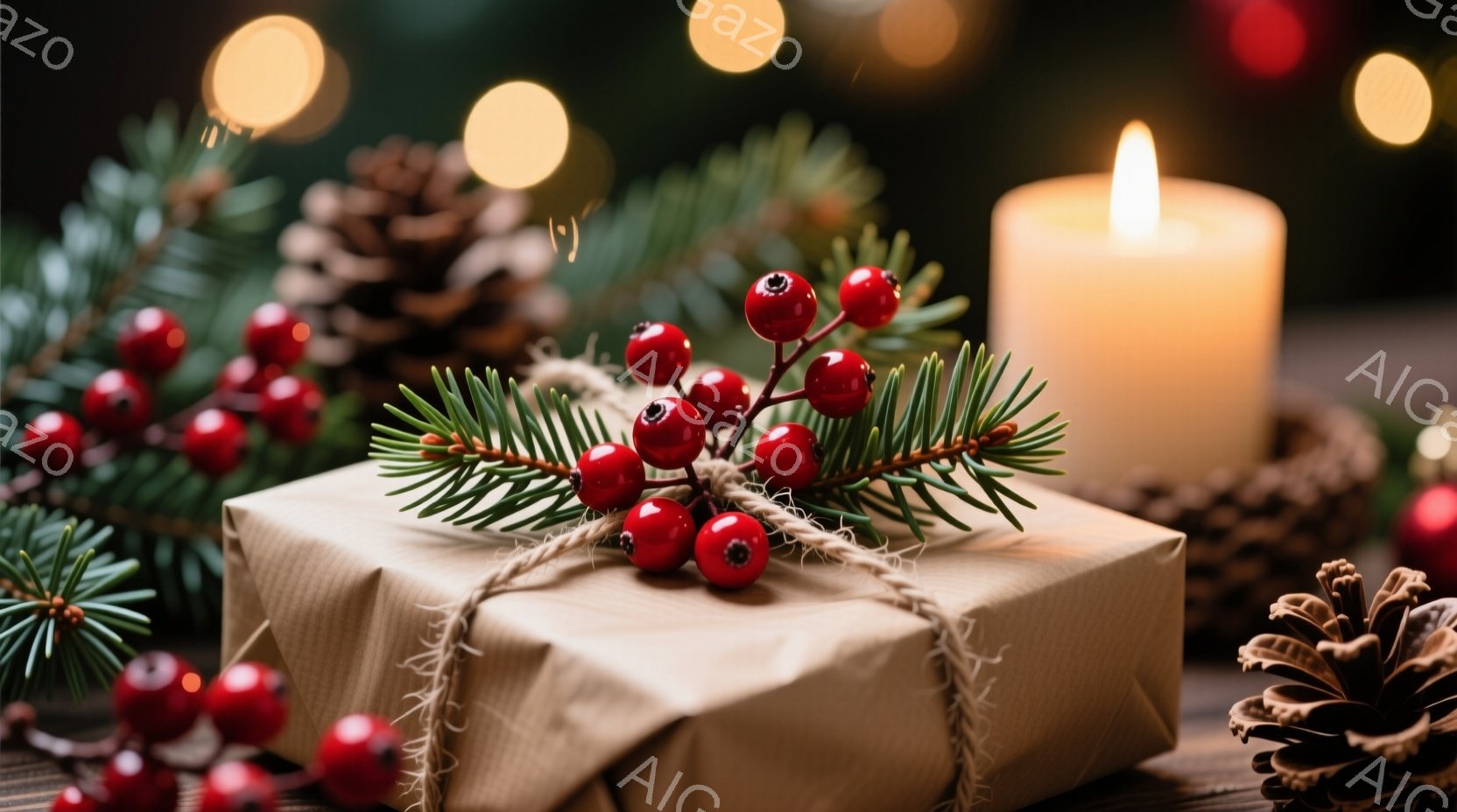 粗末な茶色の包装紙で包まれたプレゼントが、テーブルの上に置かれています。松の葉と赤い実の飾りで飾られ、背景にはぼやけたキャンドルとオーナメント、そして赤い実の枝が見えます。全体的に暖かく、落ち着いたクリスマスの雰囲気が漂っています。