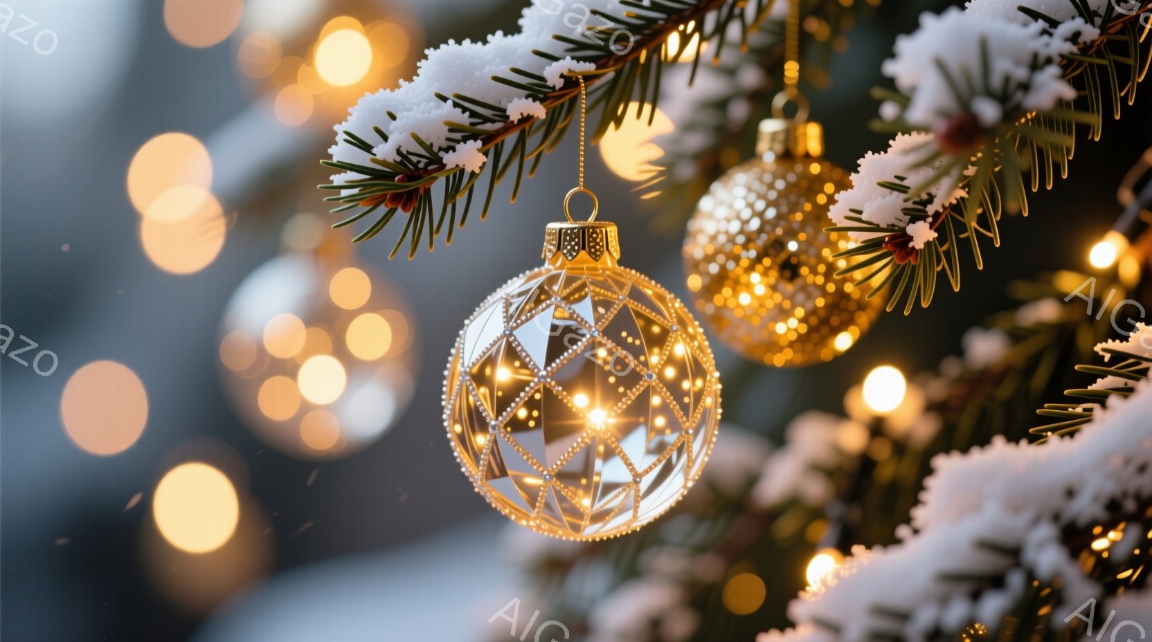 鮮やかな赤いオーナメントが数個、雪の上に置かれており、金色の模様が美しく輝いている。背景には、雪に覆われた緑の葉とぼんやりとした光が散りばめられており、冬の暖かく幻想的な雰囲気を醸し出している。雪の粒子がオーナメントの上や周囲に散らばっており、季節感と温かさを強調している。