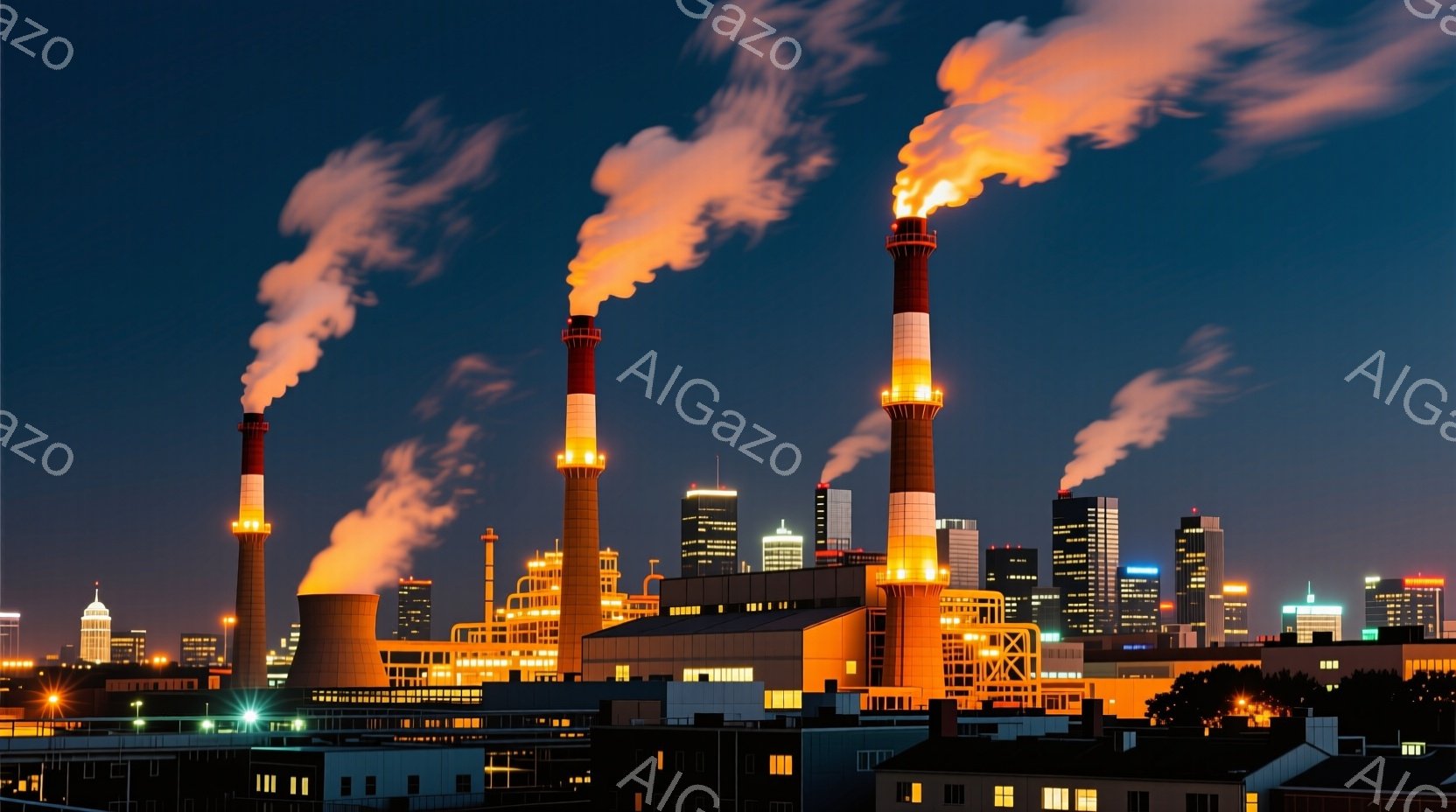 夜空の下、工業地帯が広がり、巨大な煙突から白い煙が立ち上っている。遠くには高層ビル群がオレンジ色の光で照らされ、近代的な都市景観と重工業の対比が際立つ。全体的に、オレンジと白の光が夜空に溶け込み、少し不穏ながらも力強い雰囲気を醸し出している。