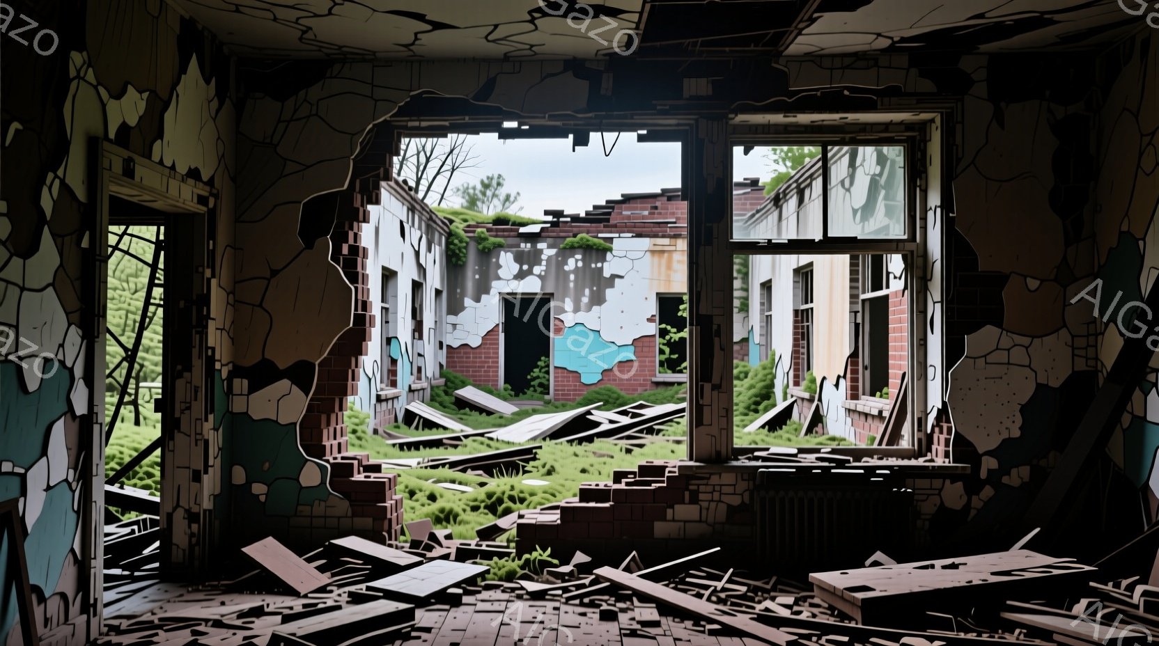 荒廃した建物の内部から見た景色で、壁は崩れ落ち、露出したレンガがむき出しになっている。室内には瓦礫が散乱し、床も崩壊しかけているが、窓からは緑豊かな草地と、遠くに見える建物のシルエットがぼんやりと見える。全体的に寂寥感と時間の経過を感じさせる、静かで陰鬱な雰囲気である。