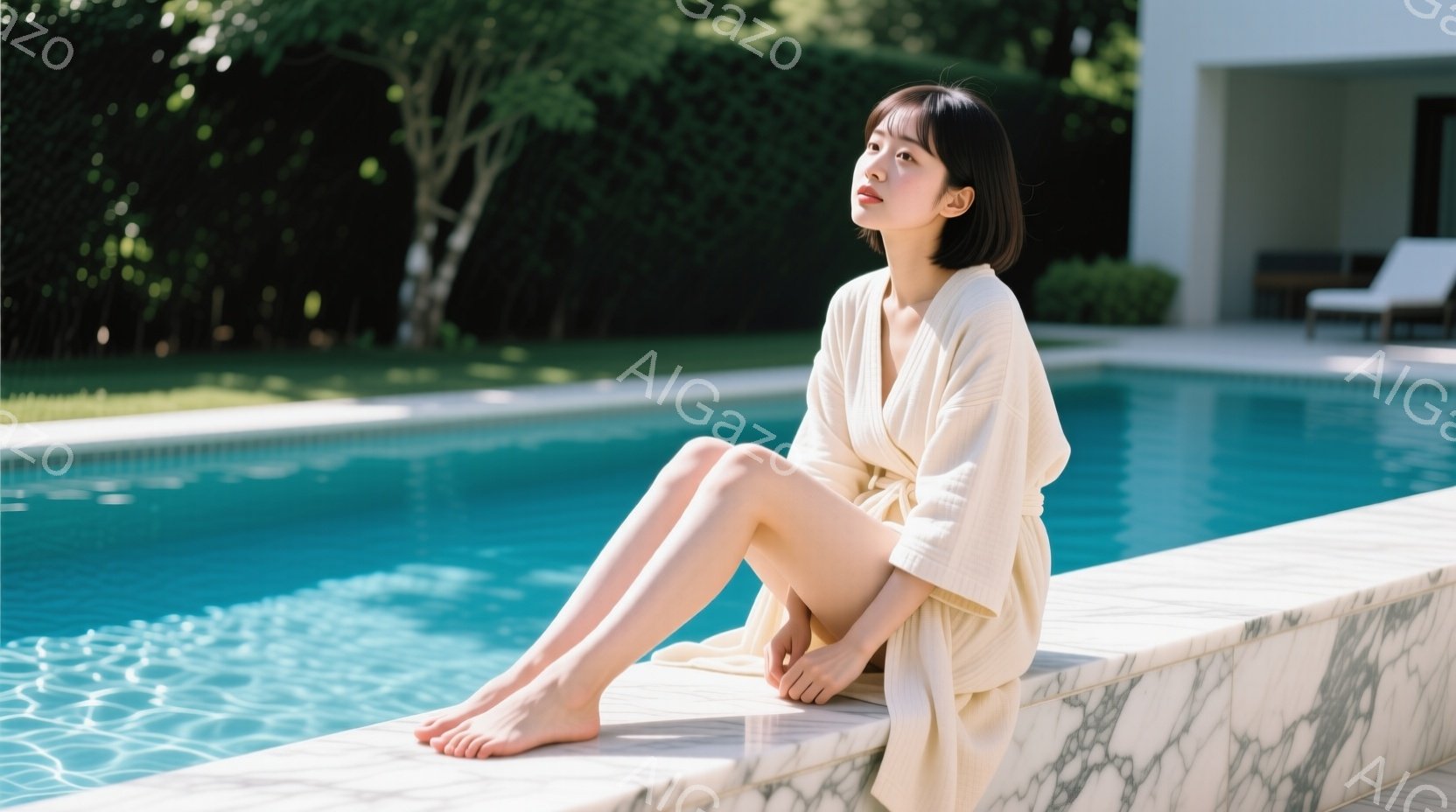 屋上プールサイドに立つ女性が写っている。銀色のビキニを着ており、濡れた髪は肩にかかっている。夕暮れ時の都市のスカイラインが背景に広がり、オレンジと紫の色合いが水面に反射している。