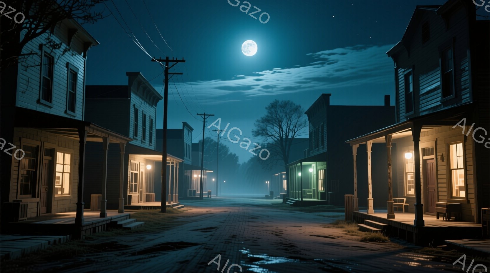 古びた西部開拓時代の街並みが月明かりの下に広がっている。石畳の道は濡れており、建物は影の中に沈み、薄暗い光が窓から漏れている。背景には暗い木々が見え、全体的に寂寥感と静寂が漂う、夜の街の風景だ。