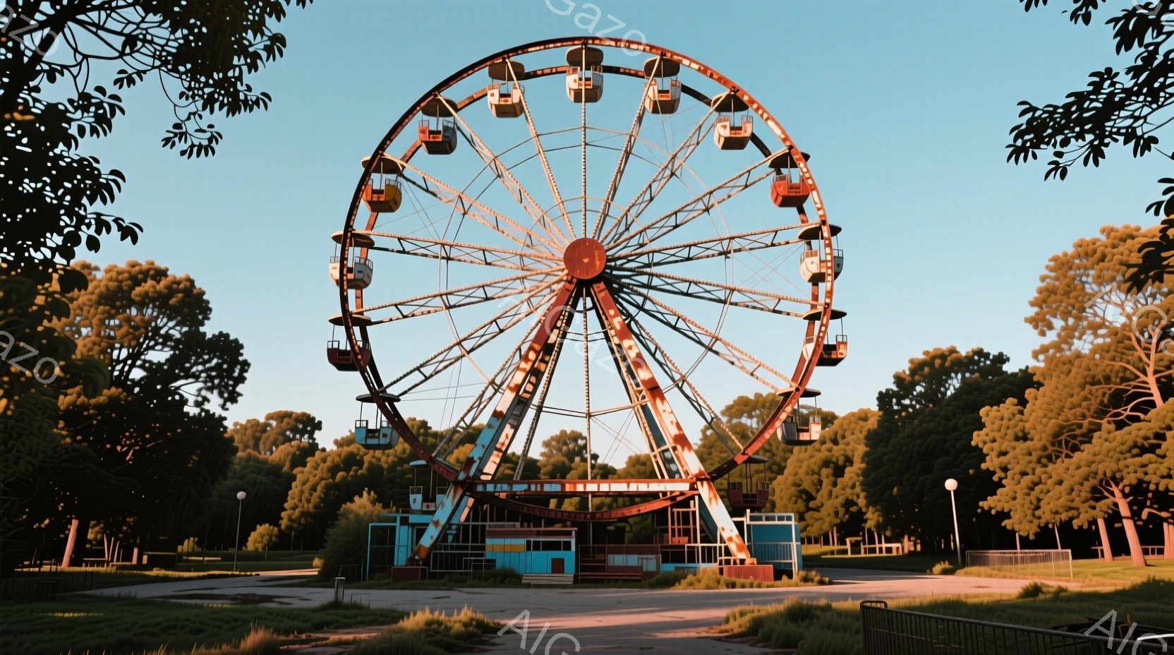さび付いた観覧車が公園の中心にそびえ立っている。建物や緑豊かな木々に囲まれ、背景には青空が広がり、天候は晴れで穏やかだ。全体的に廃墟のような雰囲気で、かつての賑わいを偲ばせる寂しげな光景が広がっている。
