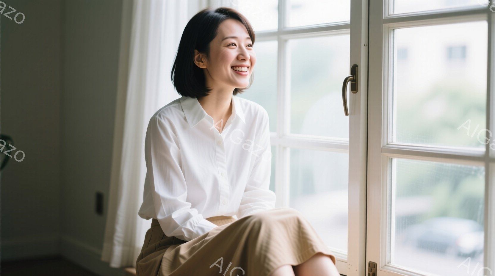 明るいピンク色のセーターを着た若い女性が、クリーム色のソファに座って右方向を見つめている。彼女は短い黒髪で、穏やかな表情を浮かべており、リラックスした雰囲気が漂っている。背景には薄い緑色の壁と木製の棚があり、部屋全体が柔らかく温かい雰囲気である。