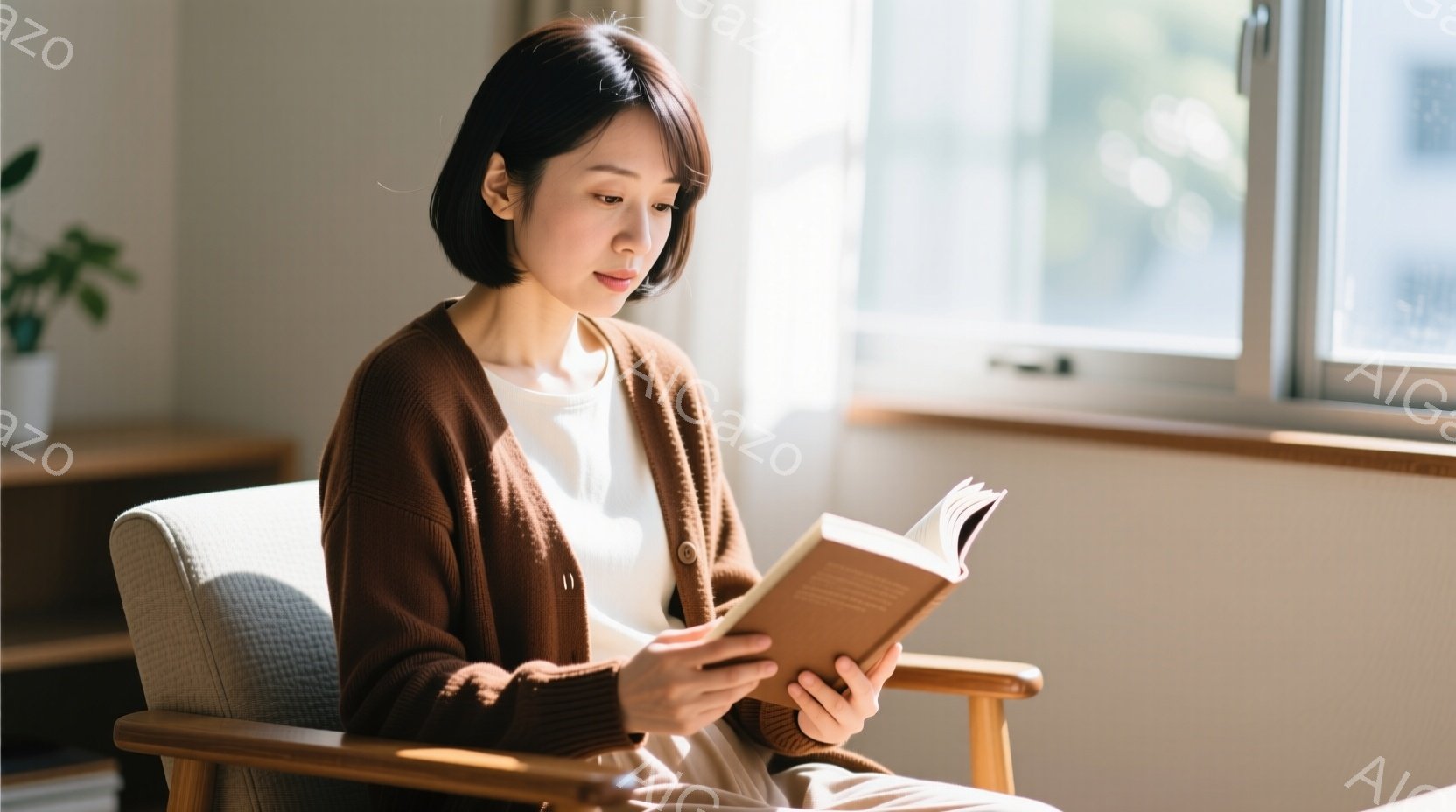 彼女はベージュのざっくりとしたニットを着て、ソファに座って温かい飲み物を手に持っています。少し横を向いて物思いにふけるような表情をしています。背景には木製のキャビネットとランプがあり、穏やかでリラックスした雰囲気が漂っています。
