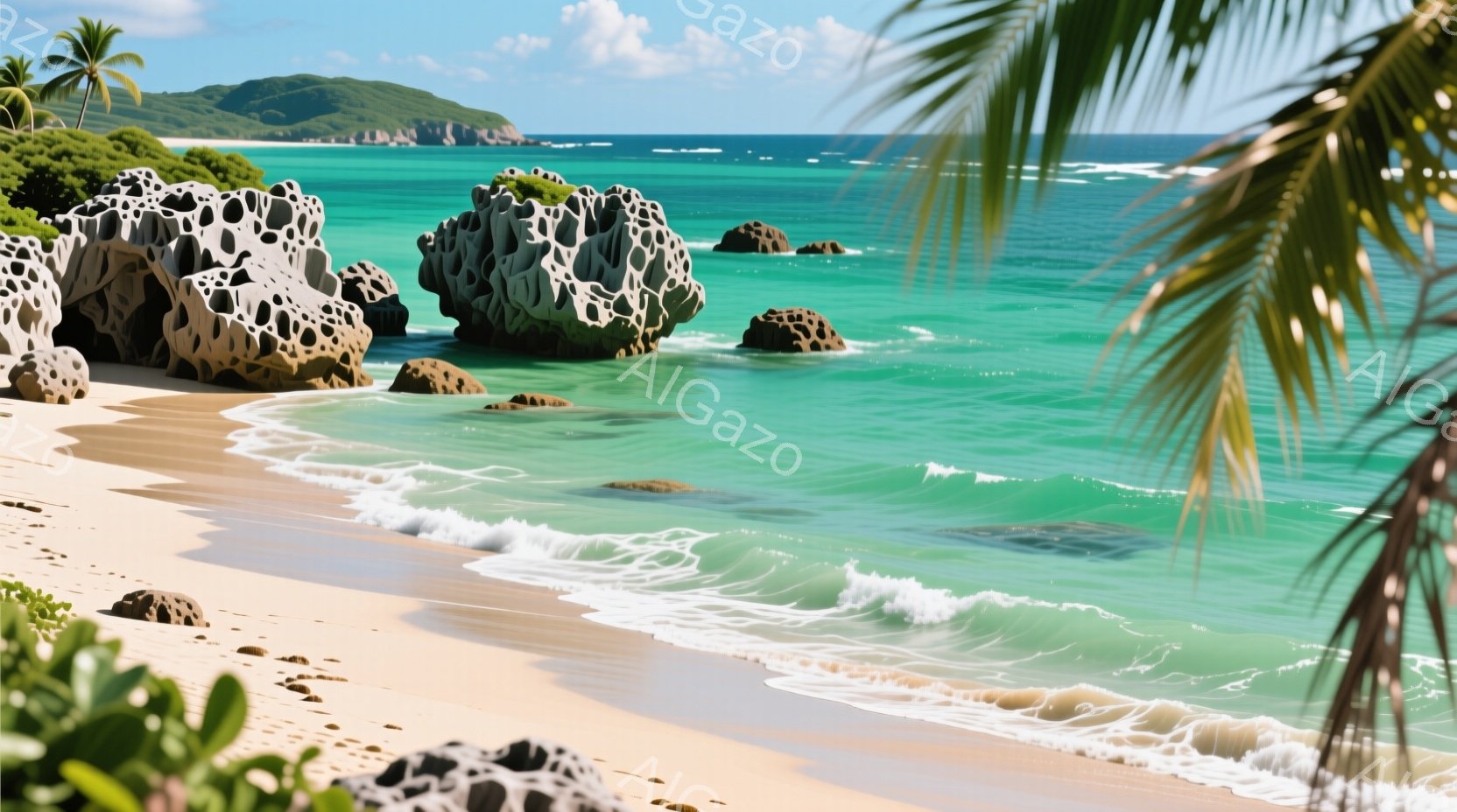 白い砂浜が広がり、ターコイズブルーの透明な海が穏やかに波打ちます。遠くには緑豊かな丘陵が見え、ヤシの木が点在し、南国リゾートの雰囲気を醸し出しています。空は青く、雲一つなく、晴れた日の静かで穏やかな情景が広がっています。