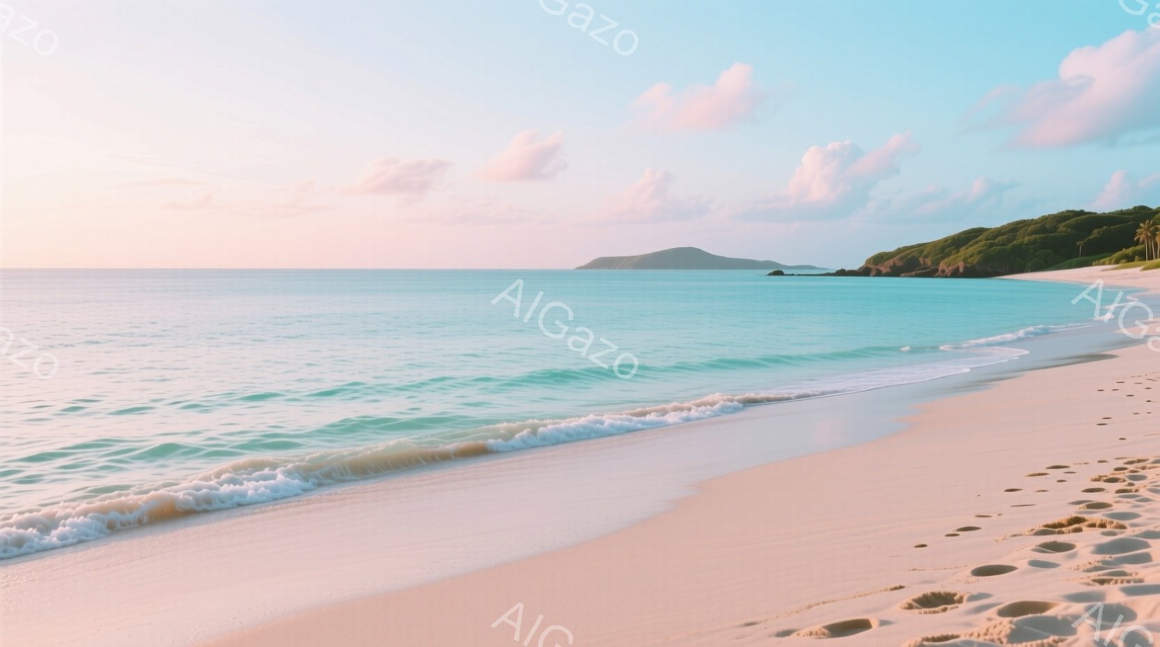 静かな海面に夕日が反射し、オレンジとピンクの色合いが広がっている。遠くには山並みが小さく見えるが、海面は穏やかで、波のきらめきが心地よい雰囲気を作り出している。全体的に、平和でリラックスした、優しい光に包まれた情景が印象的だ。
