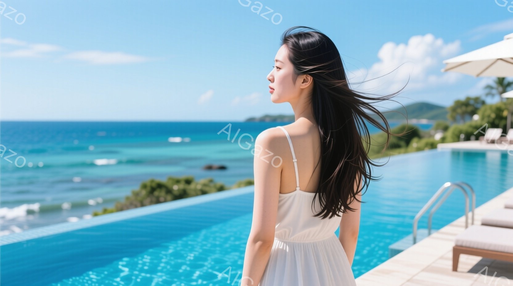 白いワンピースを着た女性が、プールサイドのデッキチェアに横たわって目を閉じてリラックスしています。背景には青い海とモダンな建物が見え、晴天の穏やかな雰囲気が漂っています。彼女は足を伸ばし、至福の表情で日光浴を楽しんでいる様子がうかがえます。