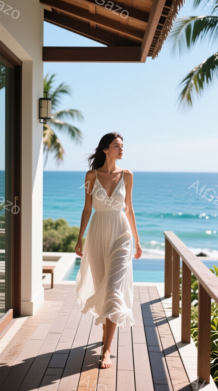 白いワンピースを着た女性が、バルコニーの手すりに寄りかかり、青い海を眺めている。彼女は黒髪で、背中を向けており表情は見えないが、リラックスした雰囲気が漂う。背景には青空と海が広がり、穏やかな日差しが差し込む、開放的で穏やかな情景である。